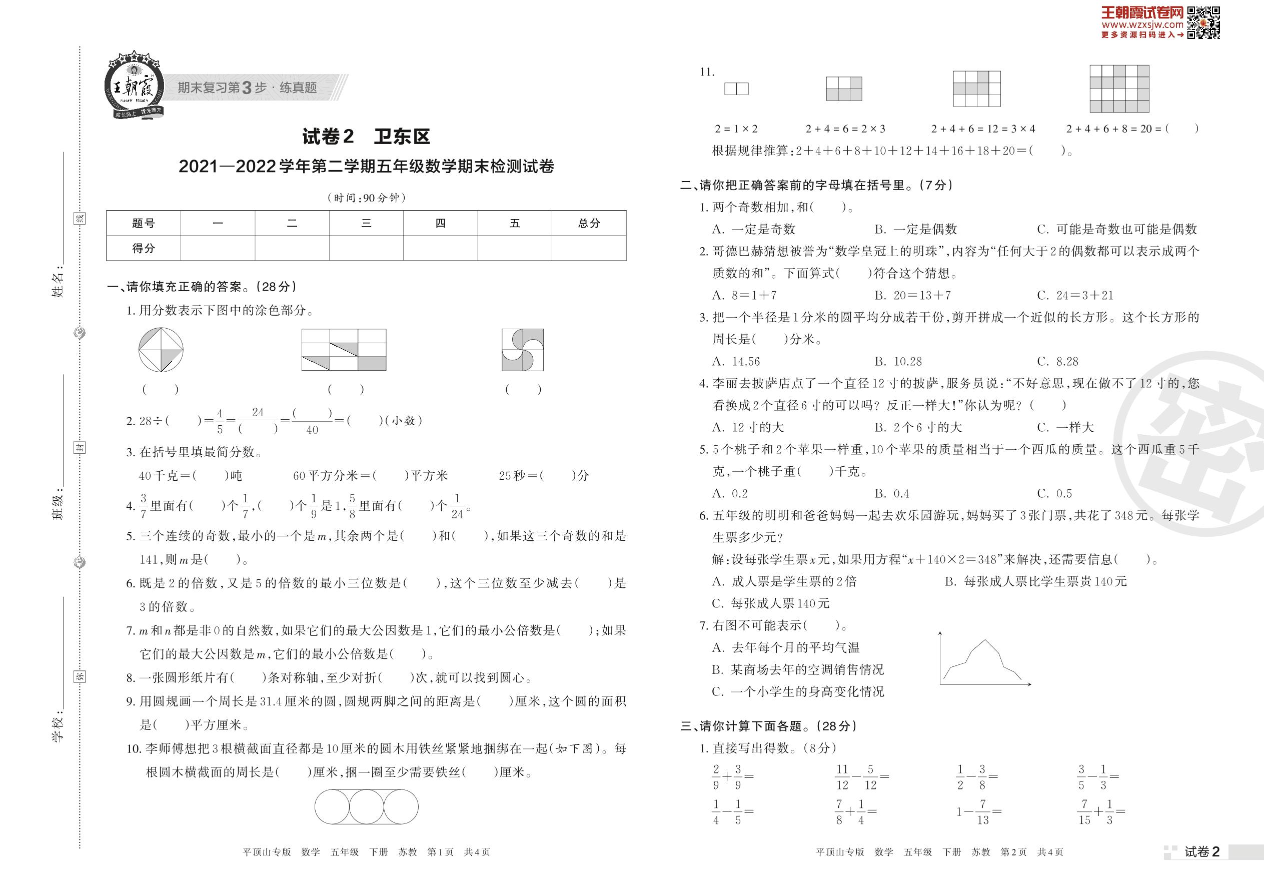 卫东区2021—2022学年第二学期五年级数学期末检测试卷(苏教版)【2】