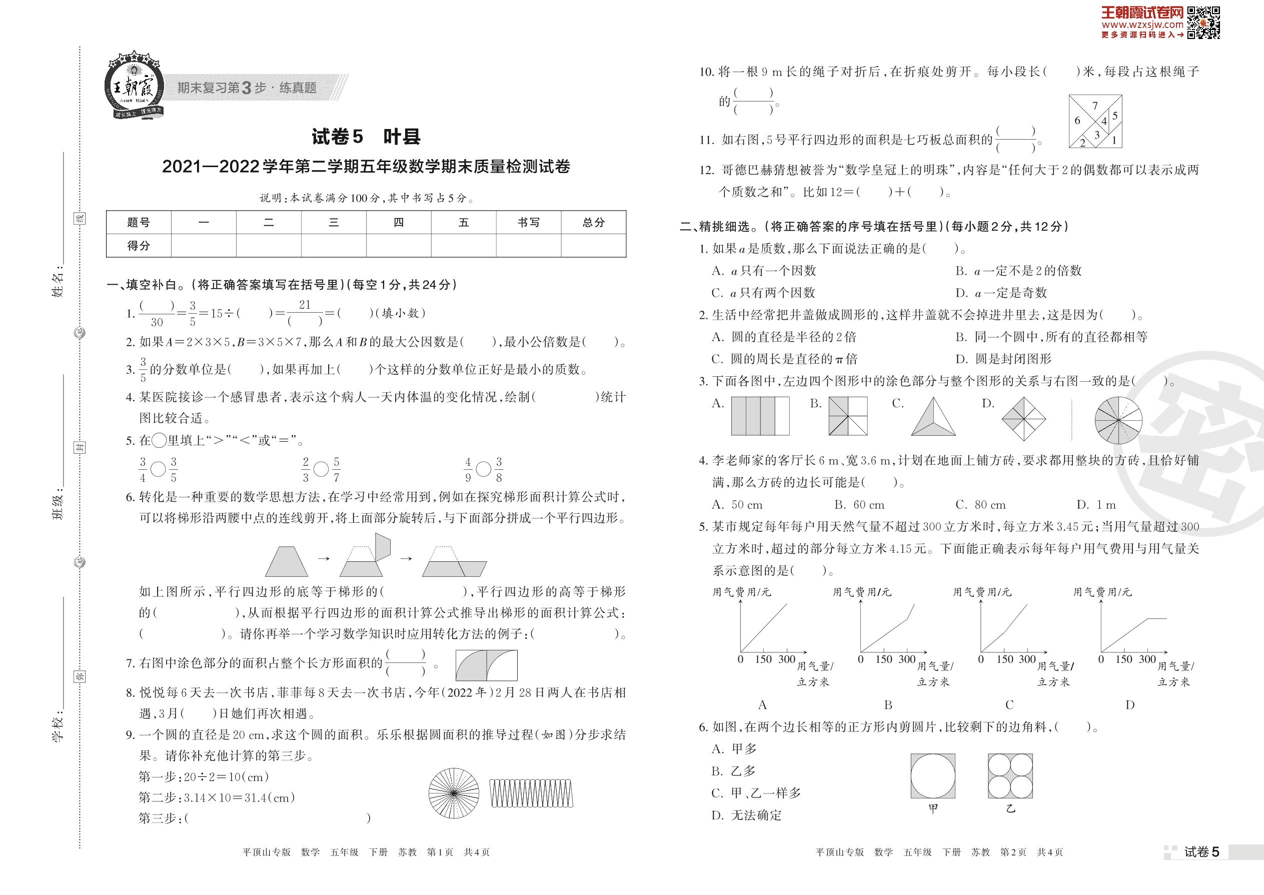 叶县2021—2022学年第二学期五年级数学期末质量检测试卷(苏教版)【5】