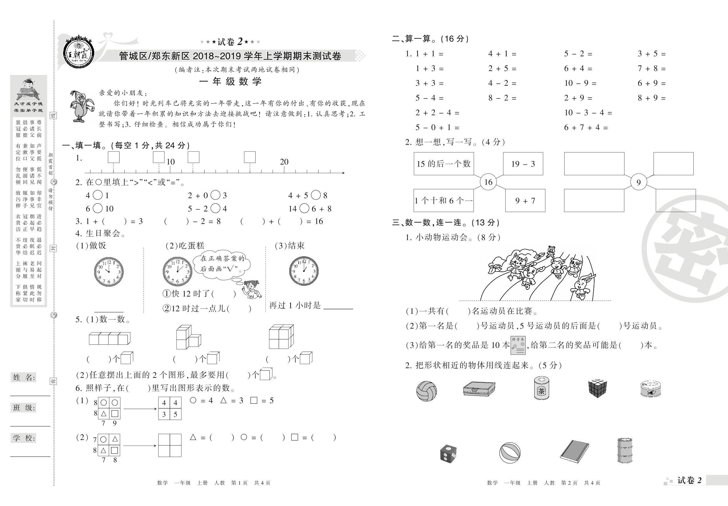 2018-2019学年第一学期郑州市管城区、郑东新区一年级数学试卷(人教版)【2】