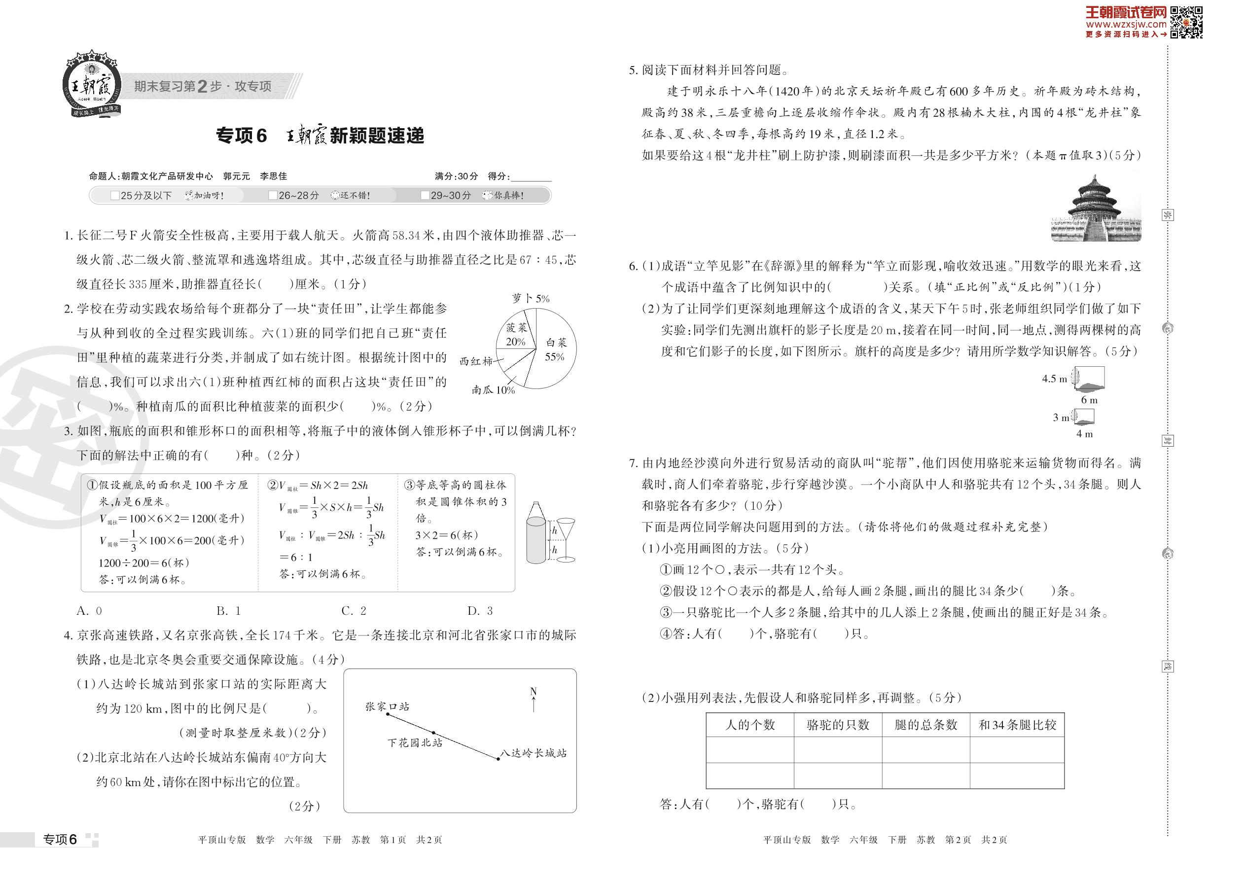 王朝霞期末专项卷——王朝霞新颖题速递:生活与数学六年级下册数学(苏教版)【6】