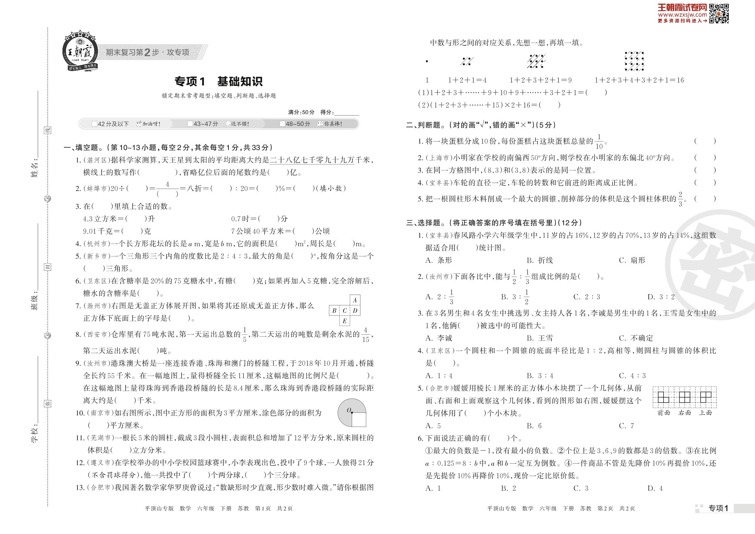 王朝霞期末专项卷——基础知识六年级下册数学(苏教版)_R230421172149710【1】