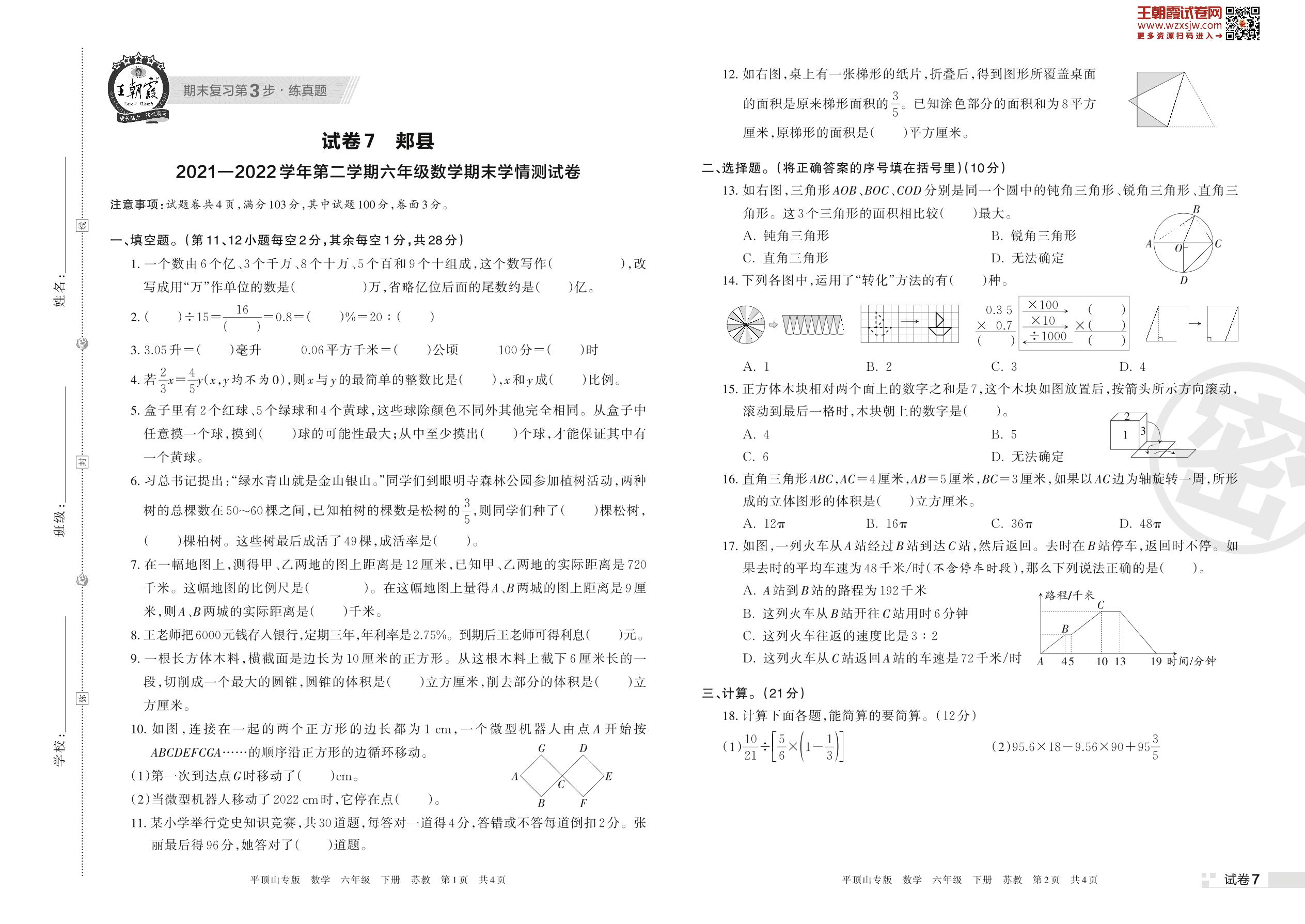 郏县2021—2022学年第二学期六年级数学期末学情测试卷(苏教版)【7】