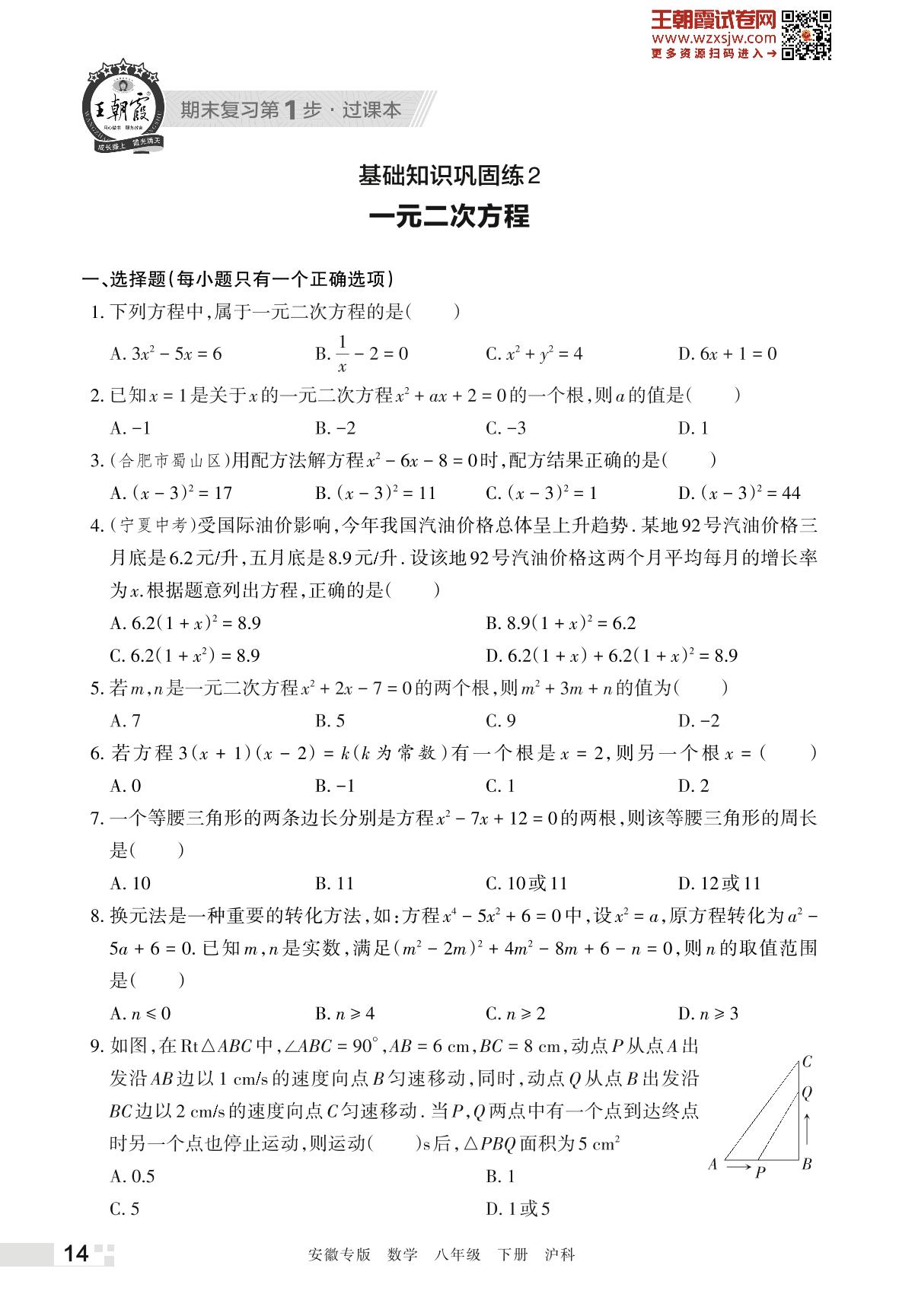 王朝霞期末过课本——基础知识巩固练2 一元二次方程八年级下册数学(沪科版)_R230421172258000