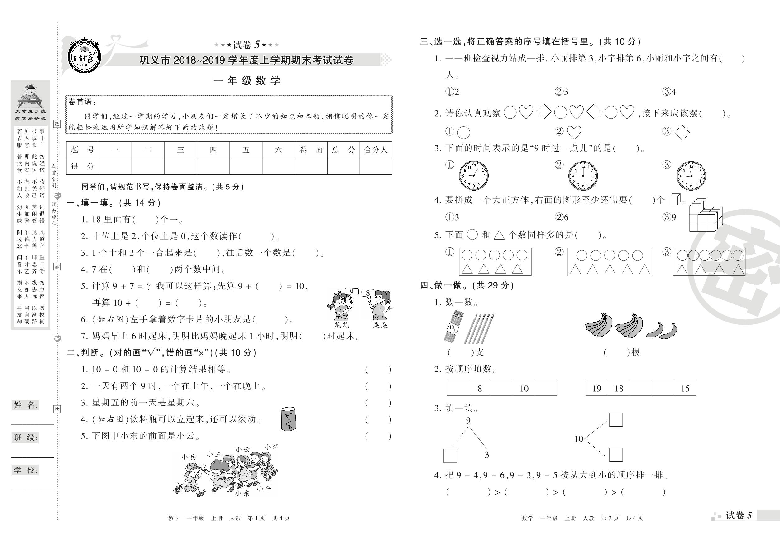 2018-2019学年第一学期巩义市一年级数学试卷(人教版)【5】