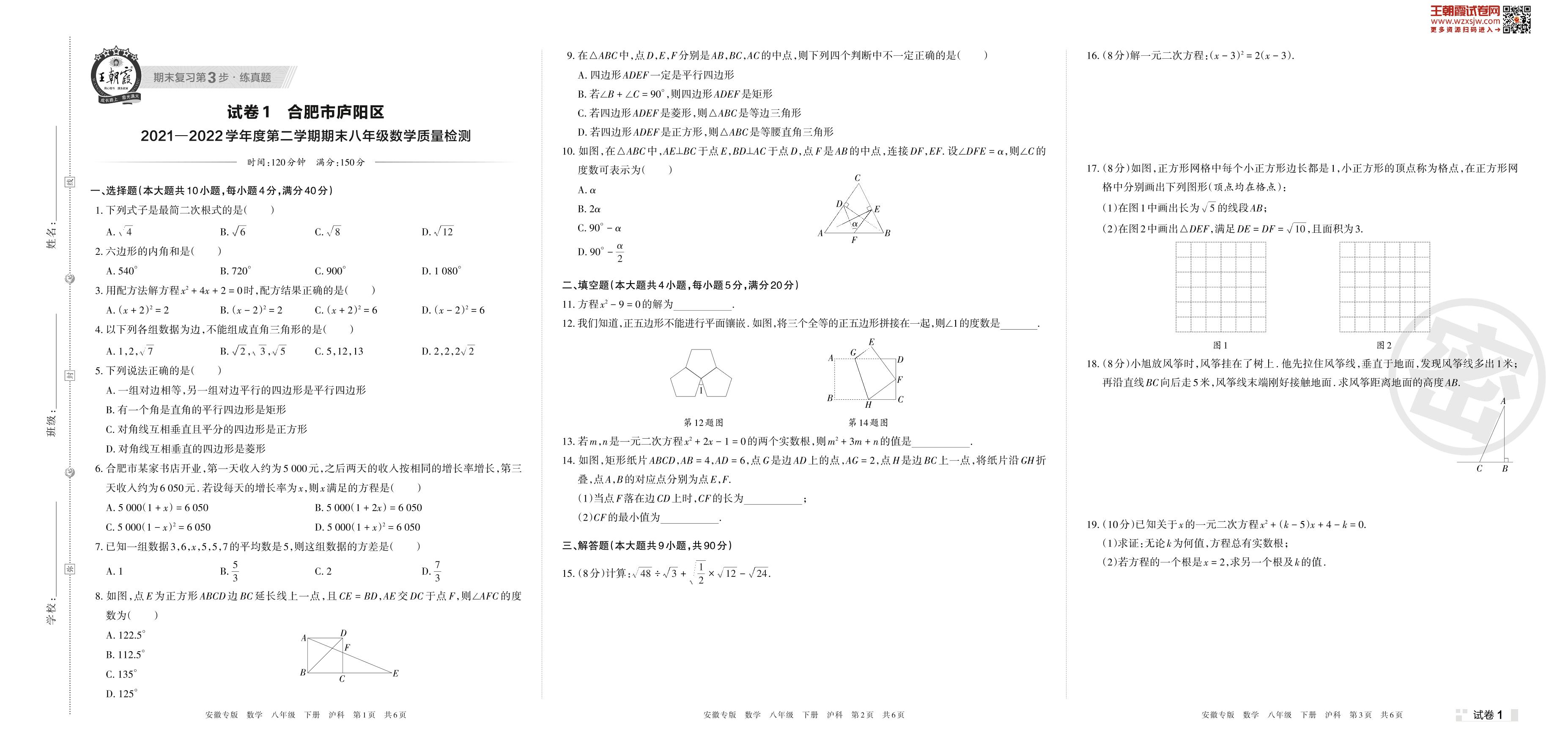 合肥市庐阳区2021—2022学年度第二学期期末八年级数学质量检测(沪科版)【1】