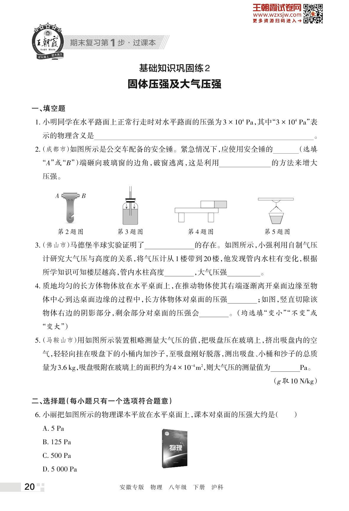 王朝霞期末过课本——基础知识巩固练2 固体压强及大气压强八年级下册物理(沪科版)_R230421173003555