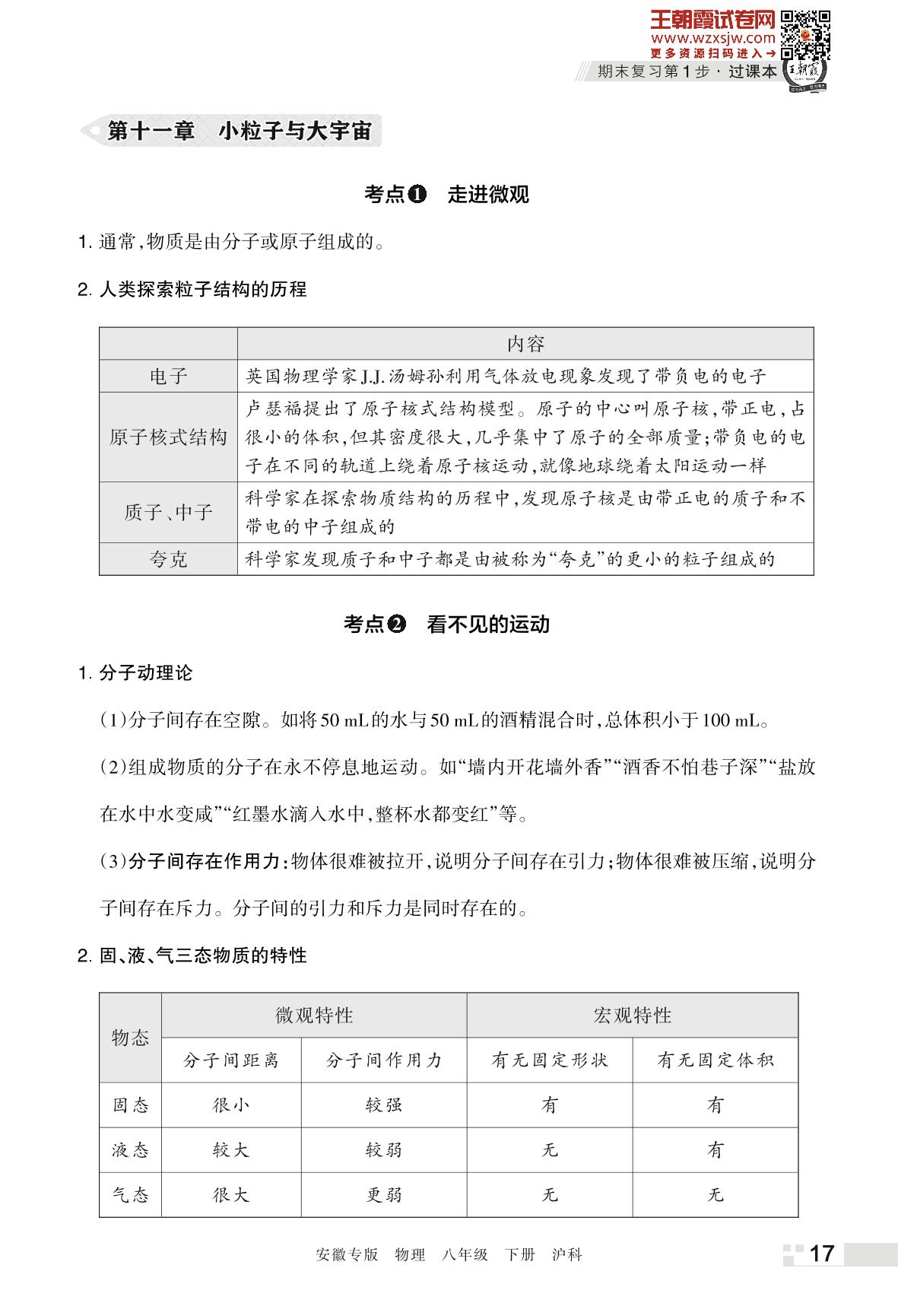 王朝霞期末知识梳理——第十一章 小粒子与大宇宙八年级下册物理(沪科版)