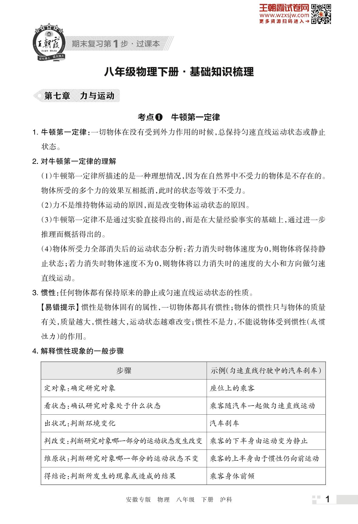 王朝霞期末知识梳理——第七章 力与运动八年级下册物理(沪科版)