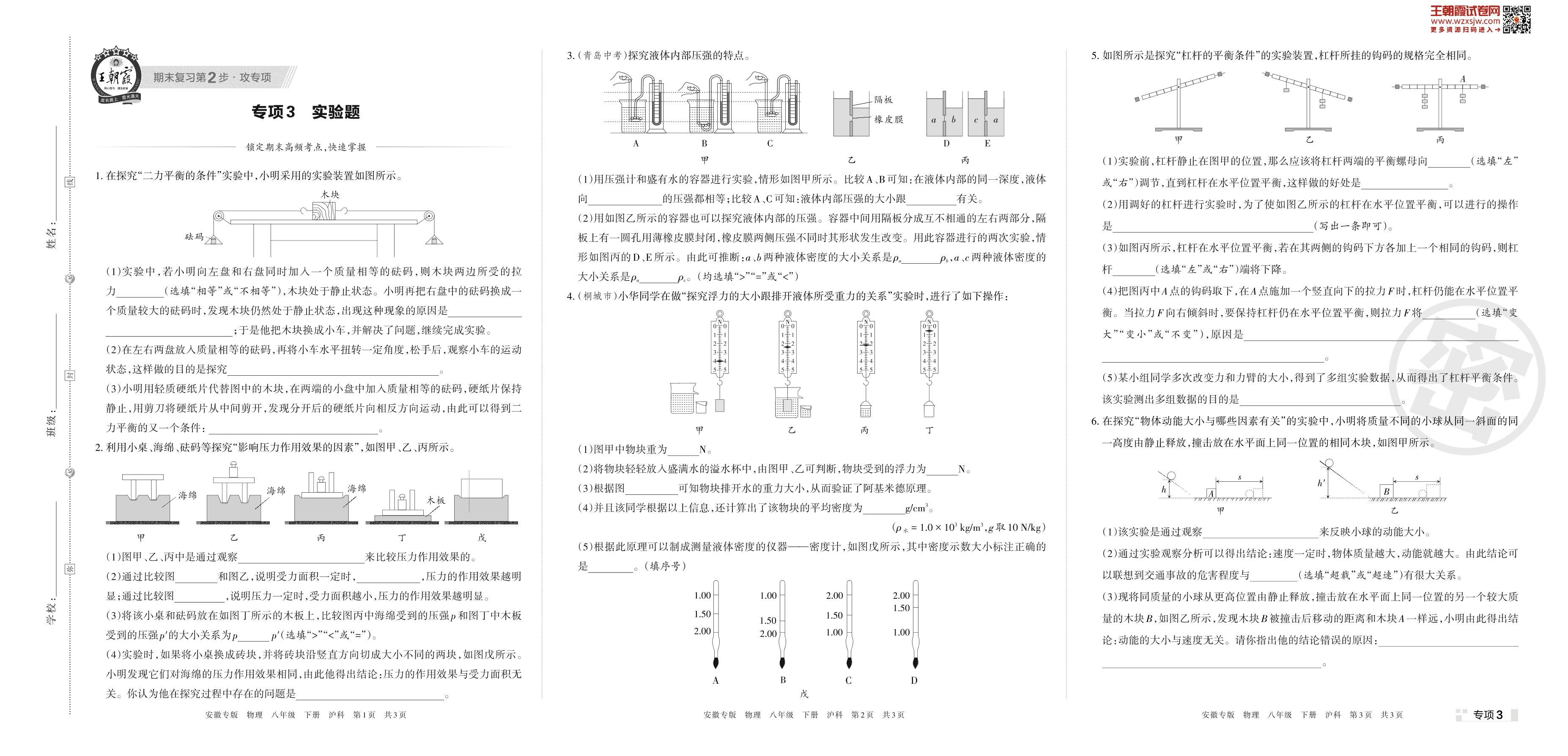 王朝霞期末专项卷——实验题八年级下册物理(沪科版)【3】