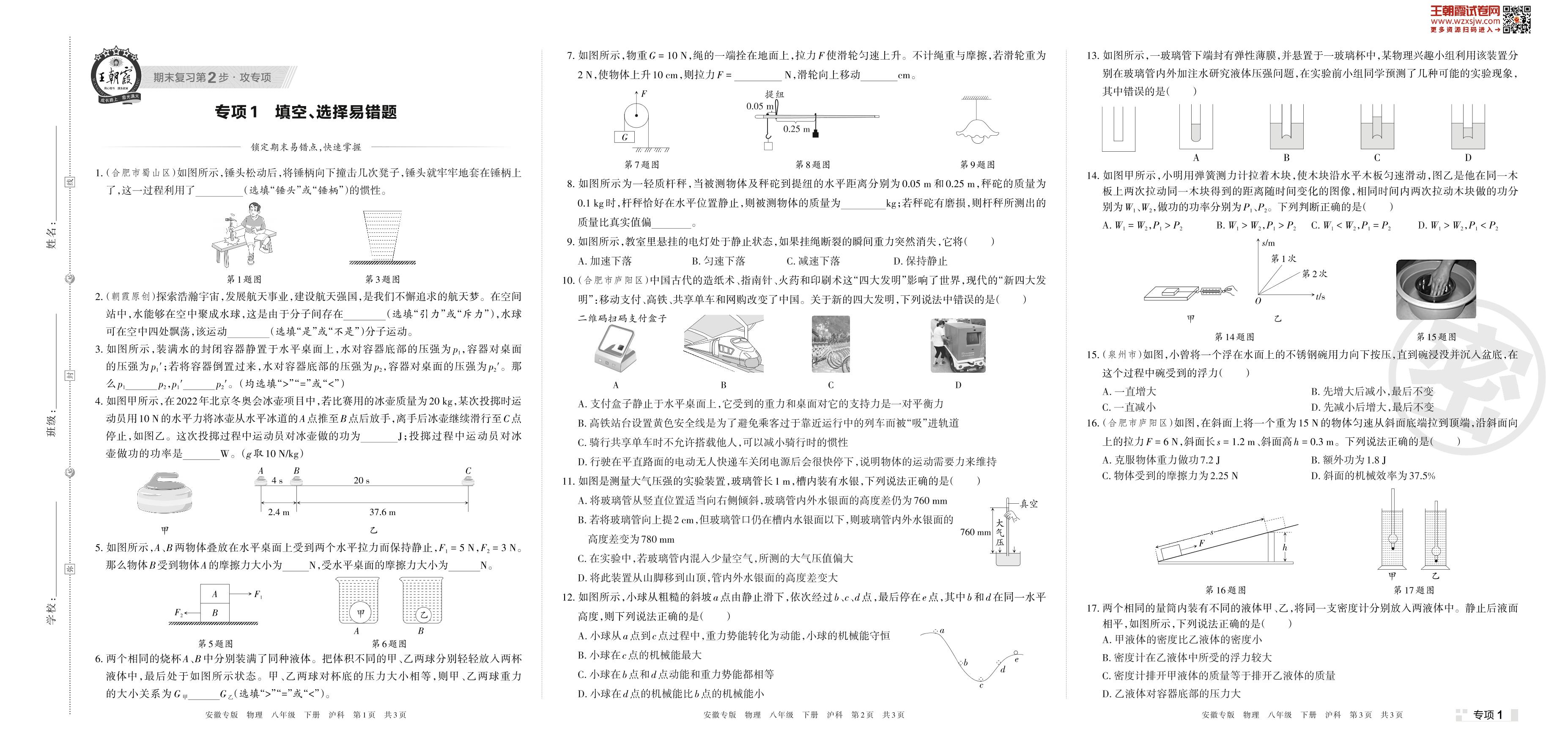 王朝霞期末专项卷——填空、选择易错题八年级下册物理(沪科版)【1】