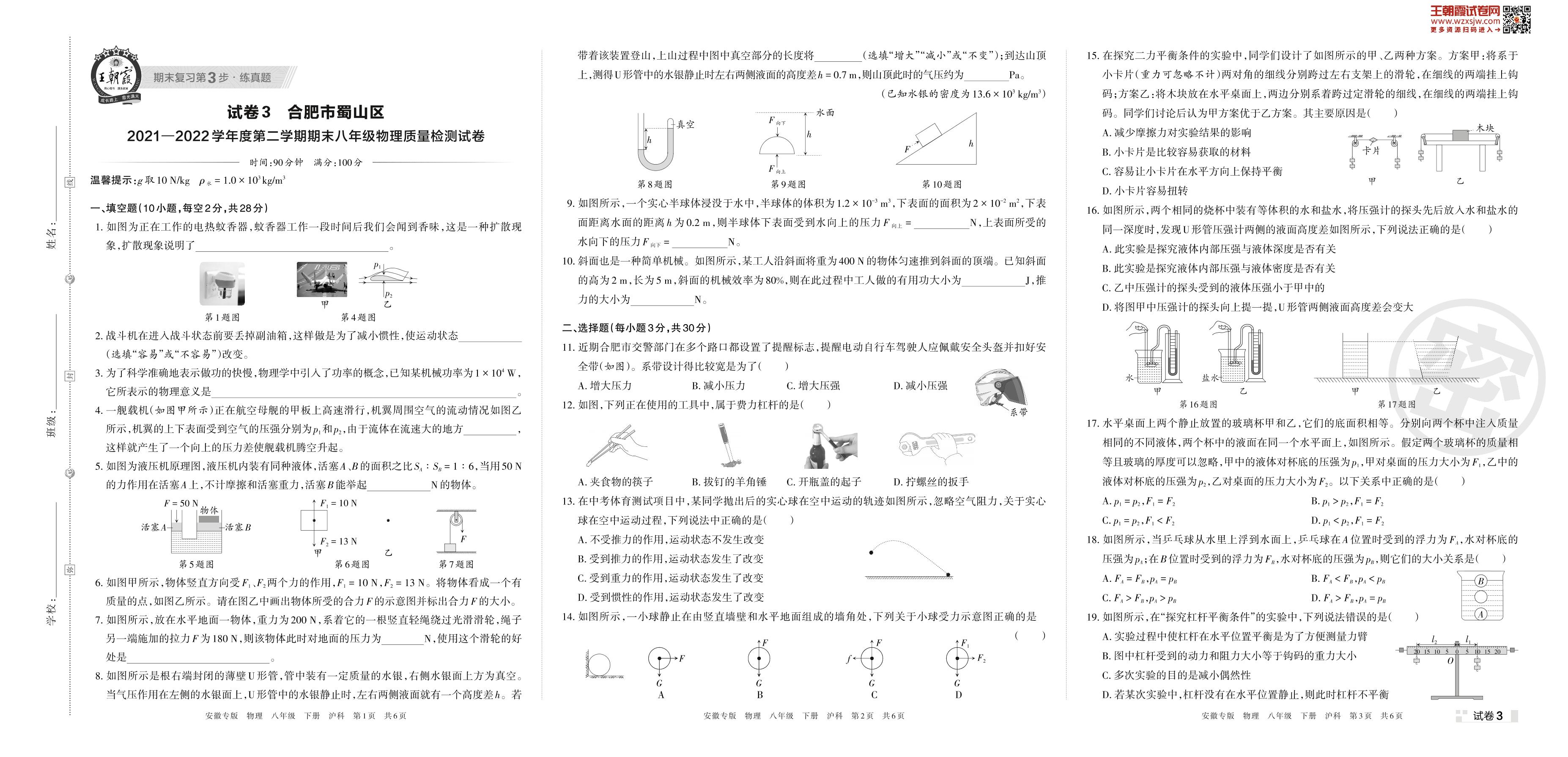 合肥市蜀山区2021—2022学年度第二学期期末八年级物理质量检测试卷(沪科版)【3】