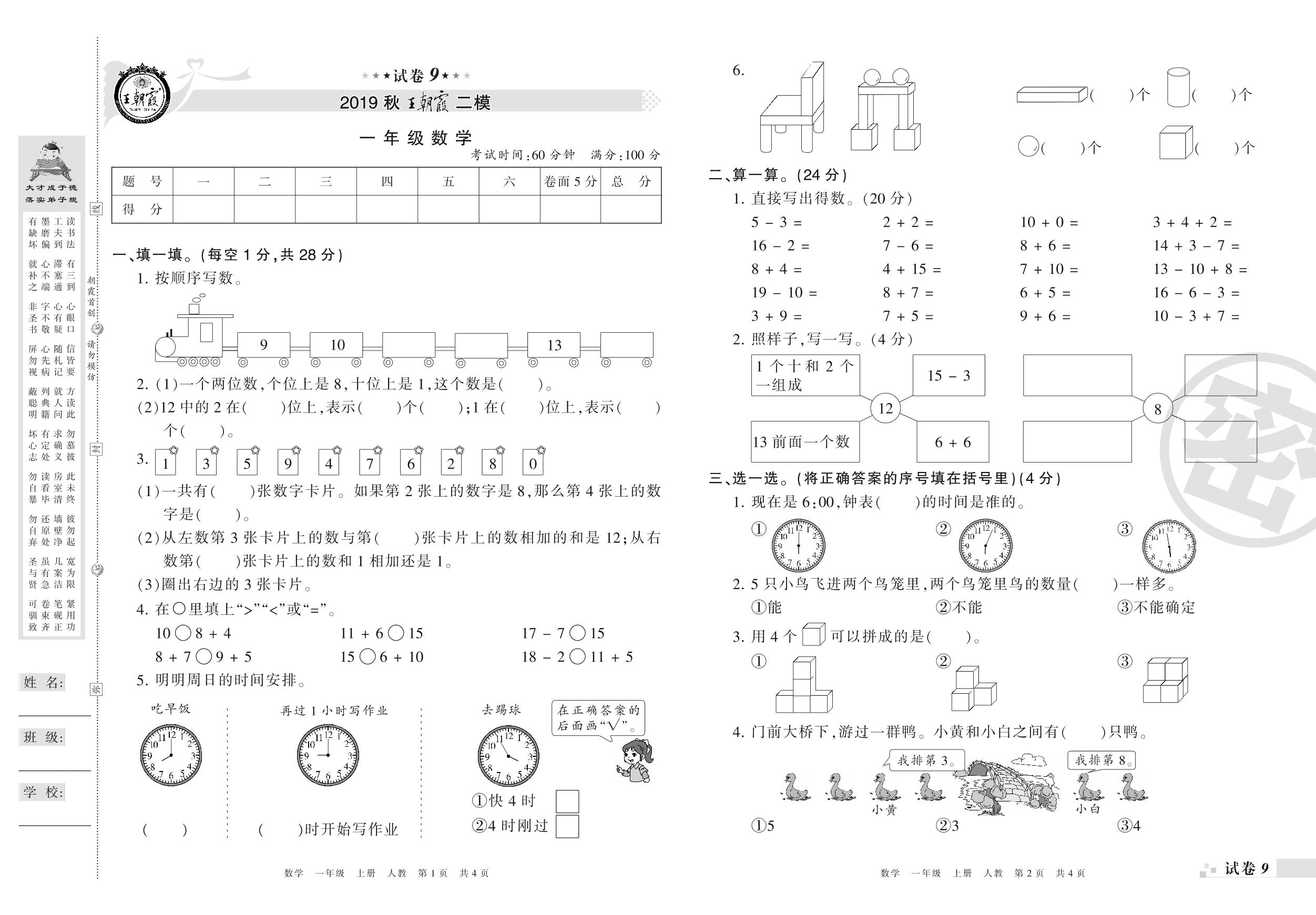 王朝霞期末模拟卷一年级上册数学(人教版)_R210802215529【9】