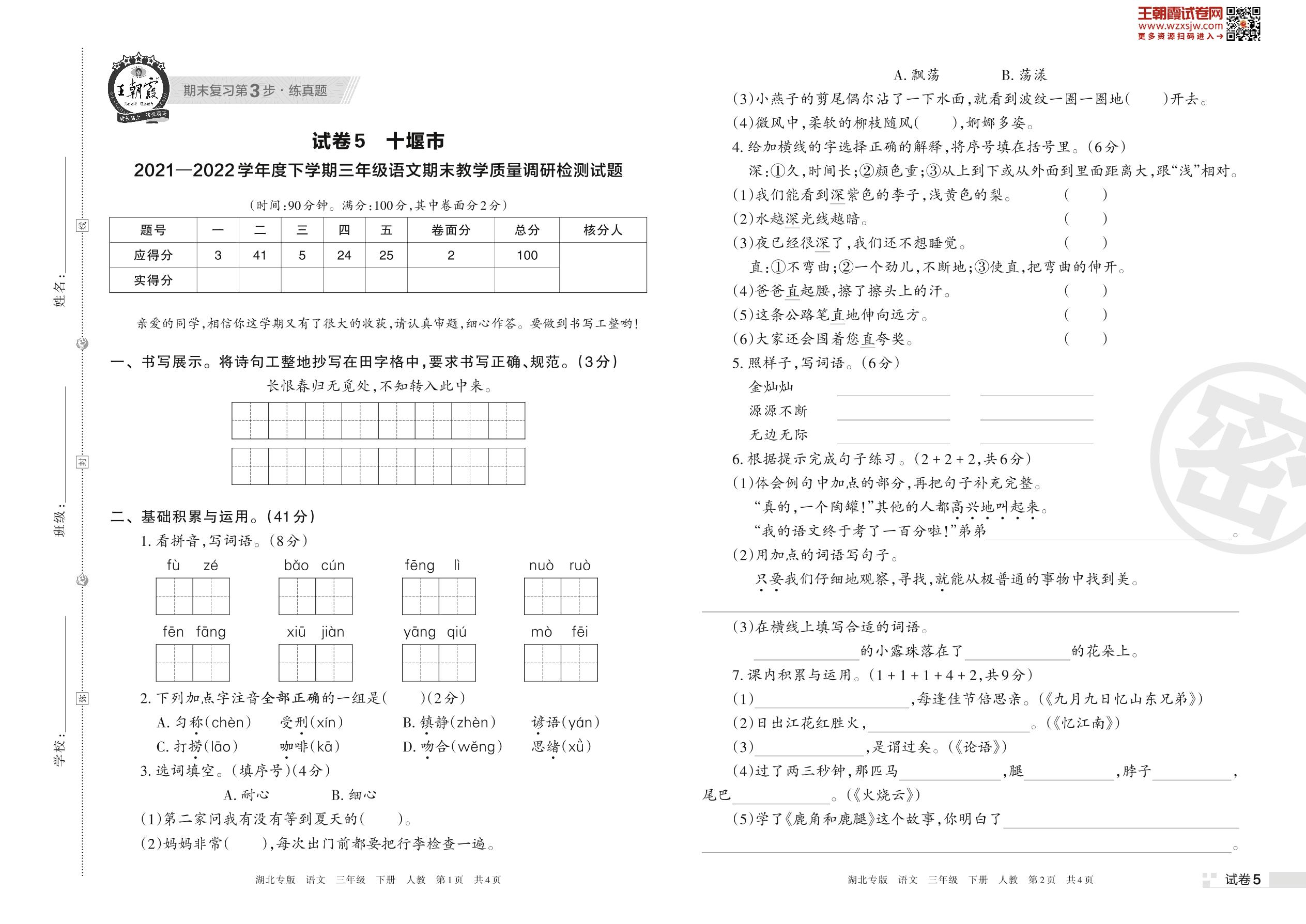 十堰市2021—2022学年度下学期三年级语文期末教学质量调研检测试题(人教版)【5】