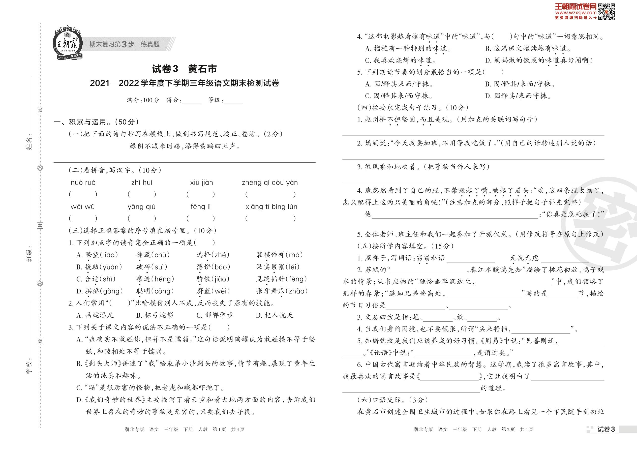 黄石市2021—2022学年度下学期三年级语文期末检测试卷(人教版)【3】