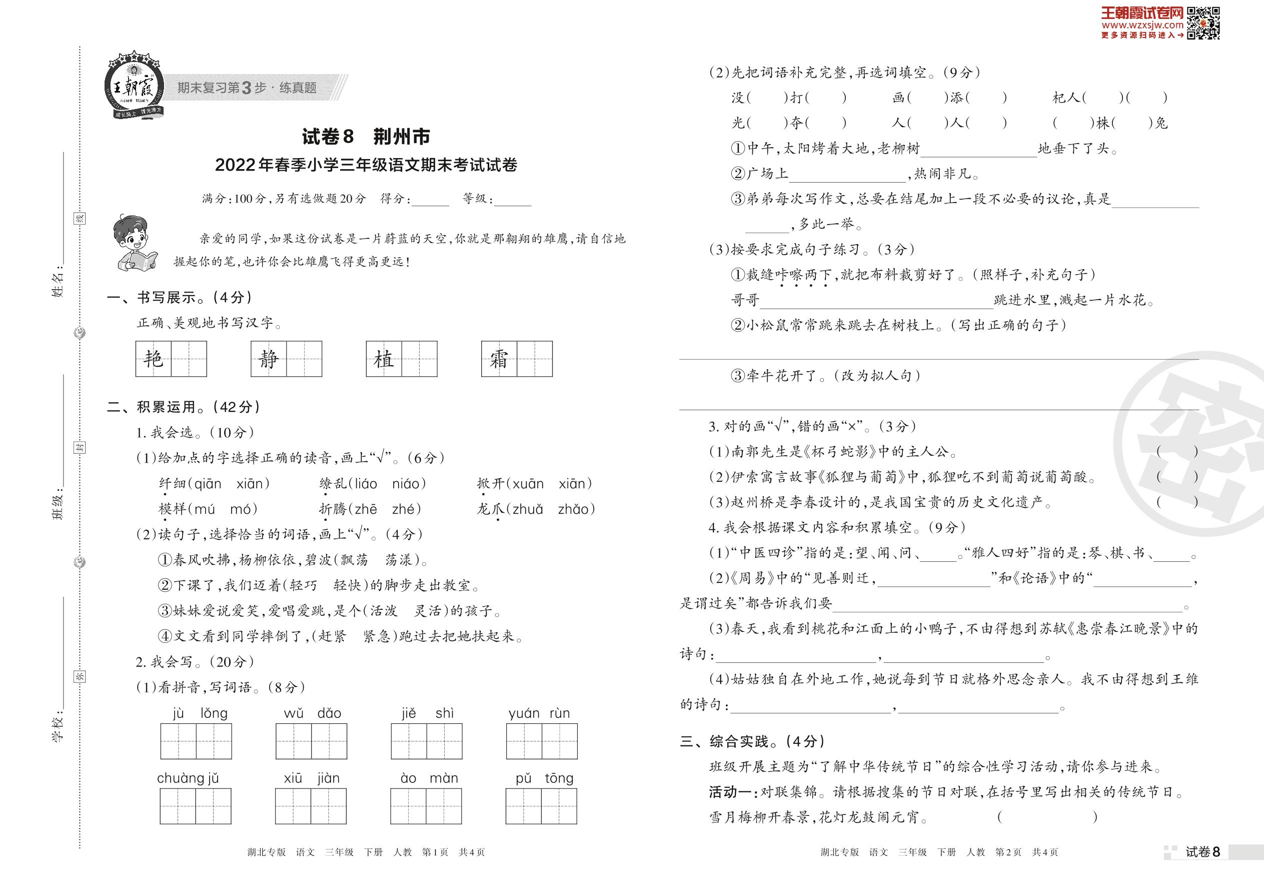 荆州市2022年春季小学三年级语文期末考试试卷(人教版)【8】