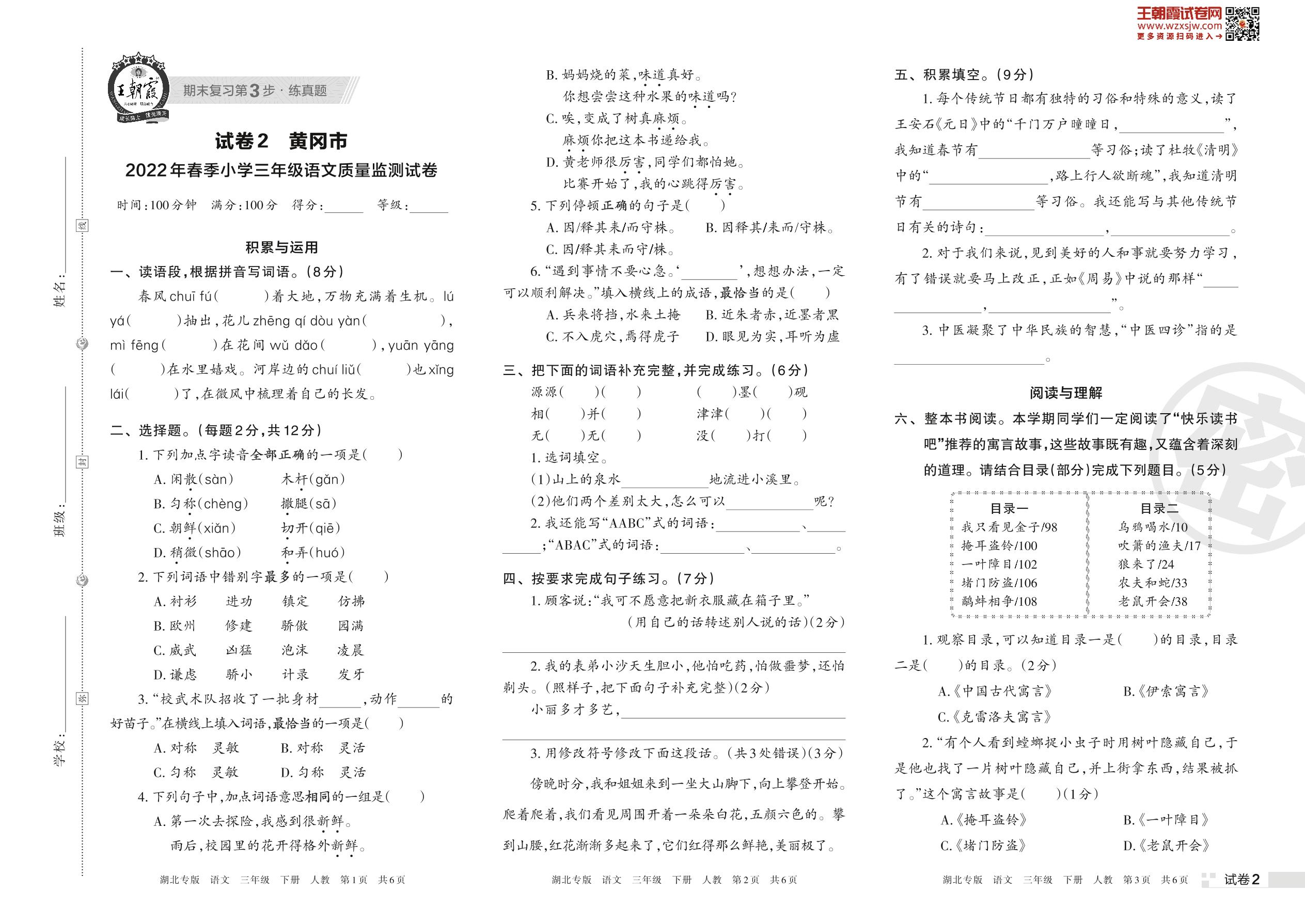 黄冈市2022年春季小学三年级语文质量监测试卷(人教版)【2】