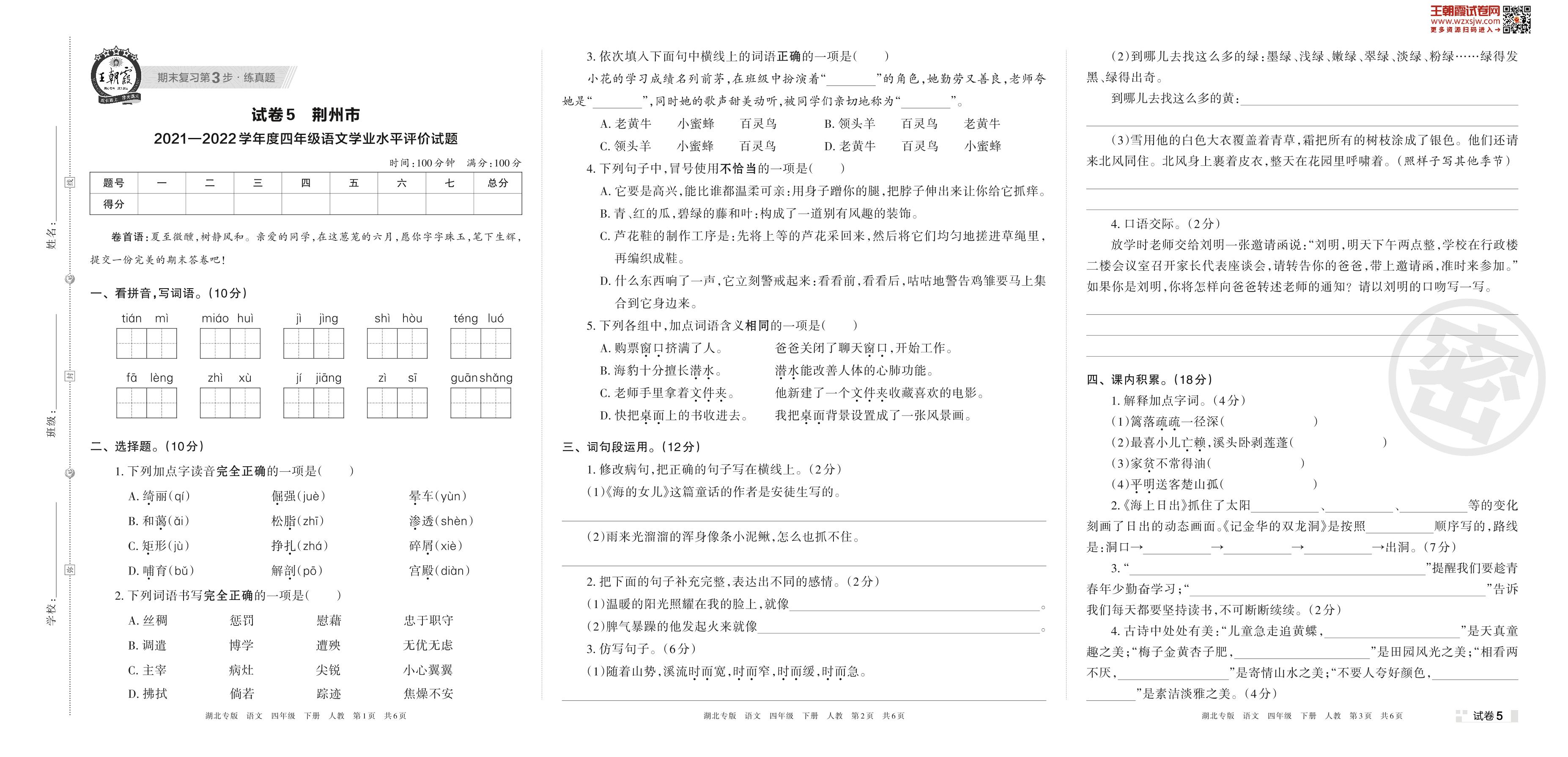 荆州市2021—2022学年度四年级语文学业水平评价试题(人教版)【5】