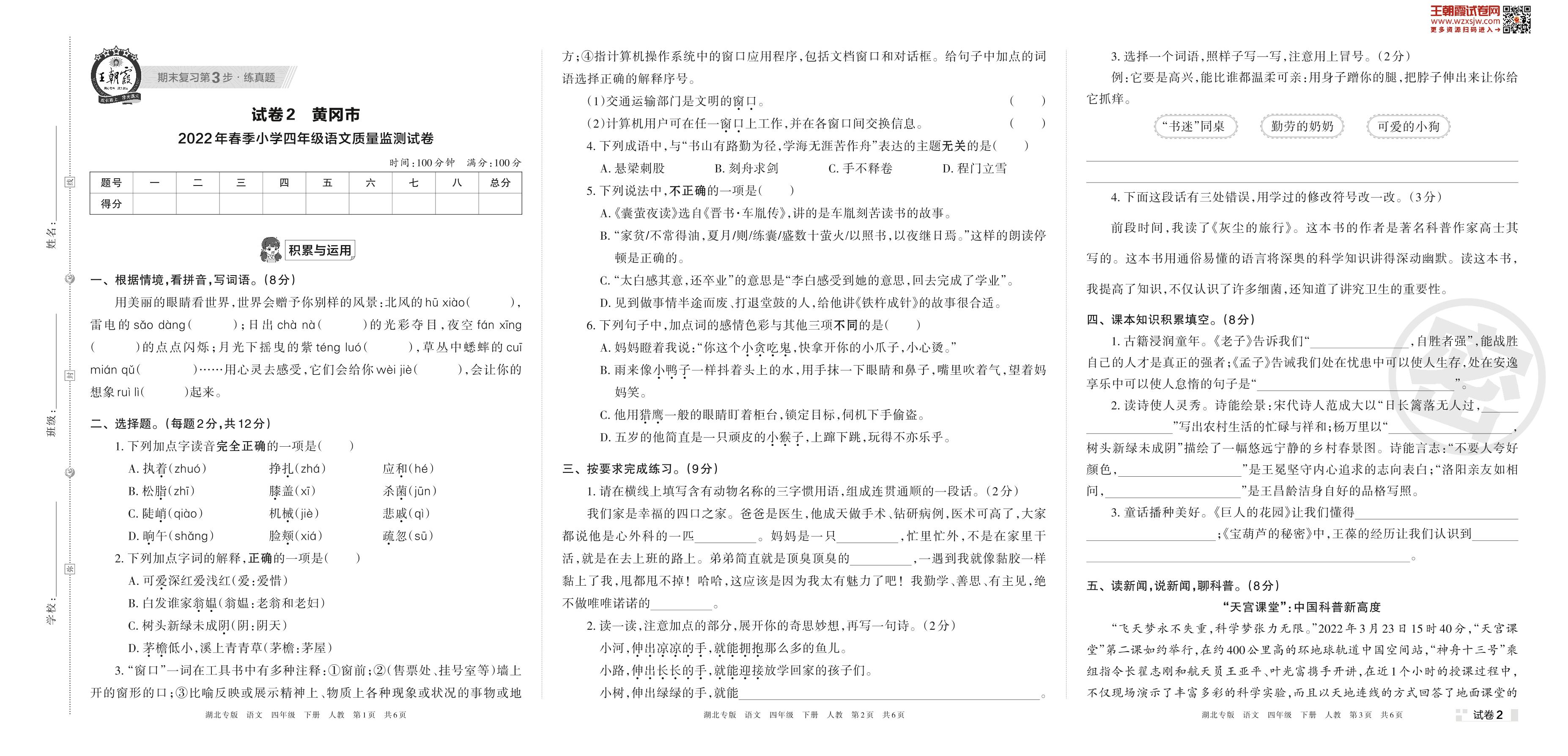 黄冈市2022年春季小学四年级语文质量监测试卷(人教版)【2】