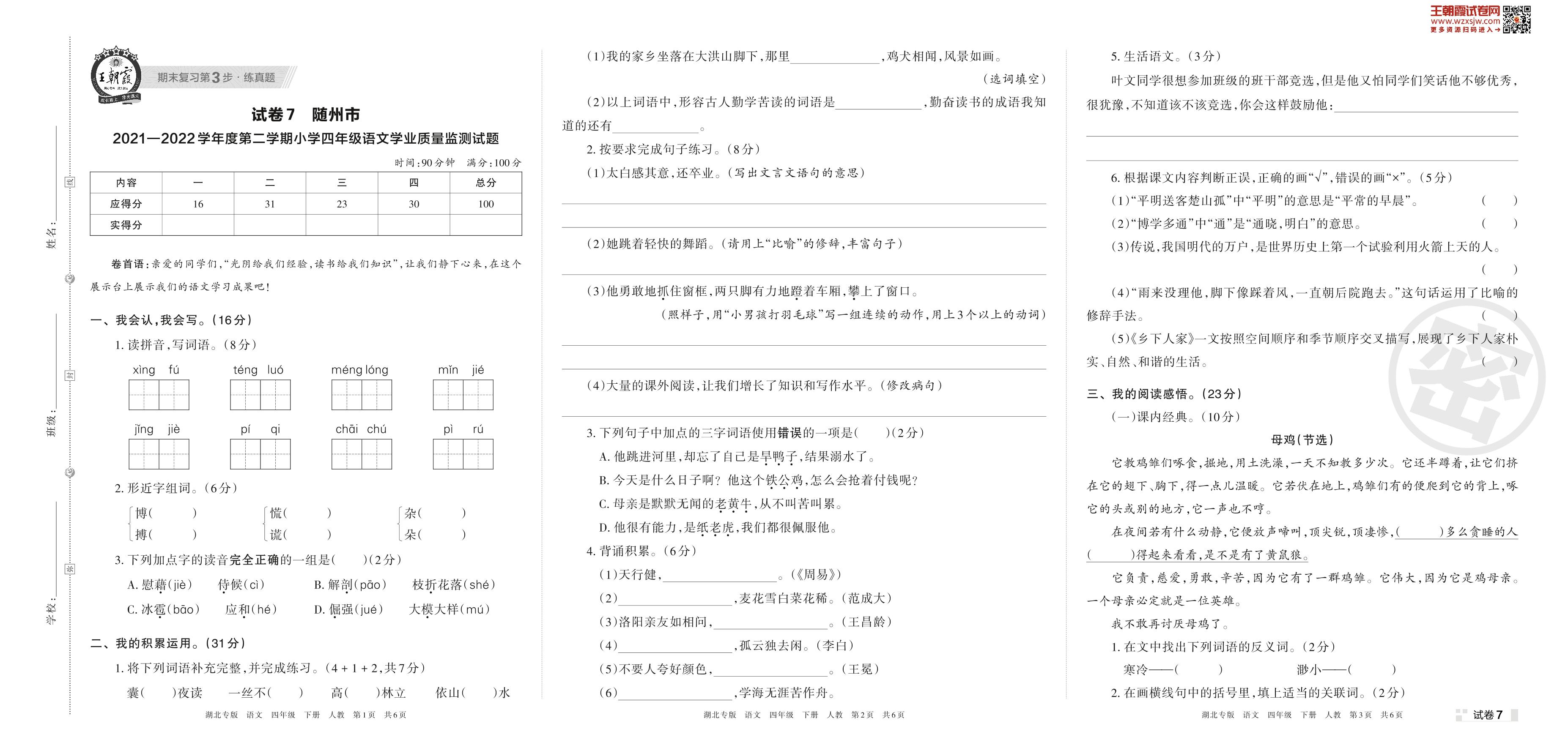 随州市2021—2022学年度第二学期小学四年级语文学业质量监测试题(人教版)【7】