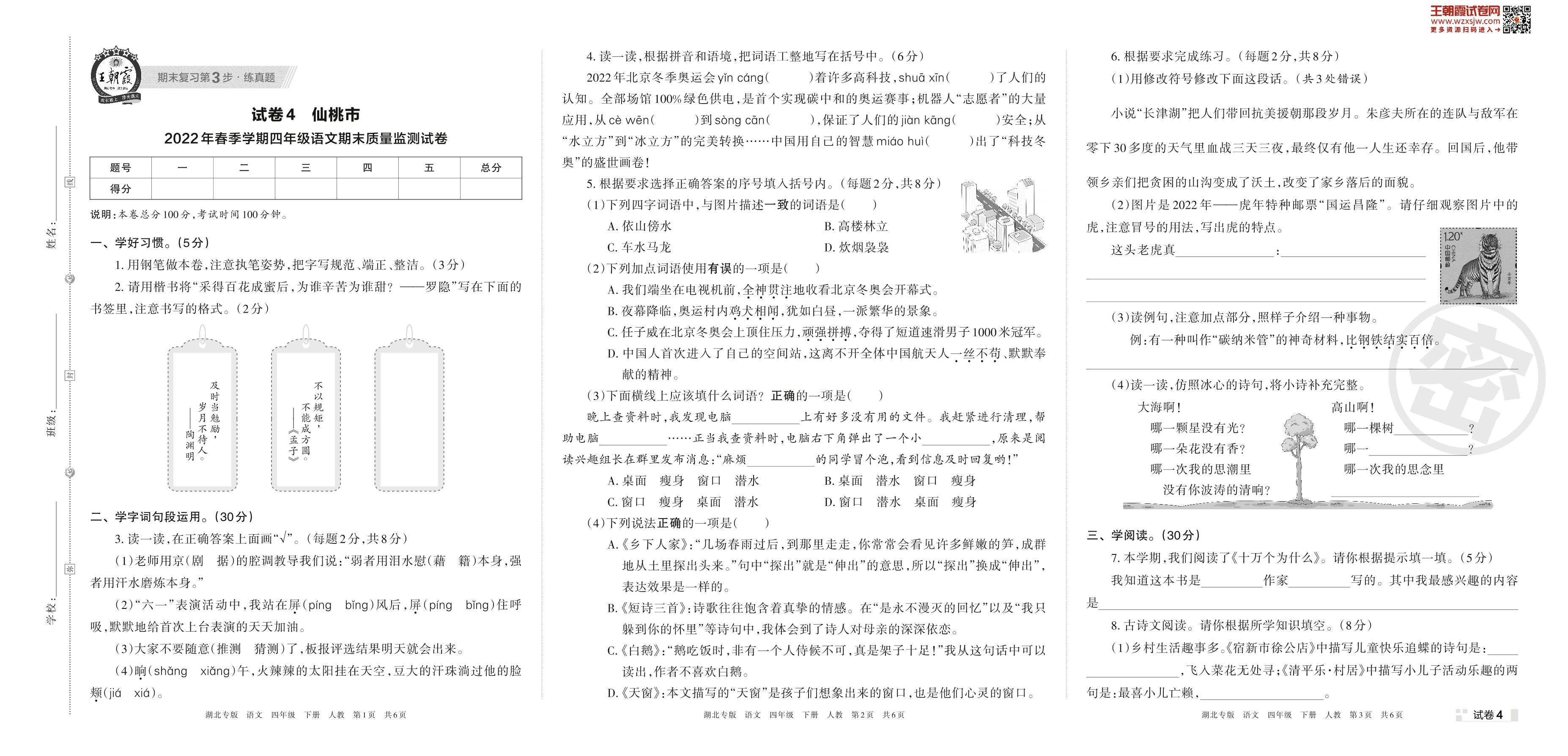 仙桃市2022年春季学期四年级语文期末质量监测试卷(人教版)【4】