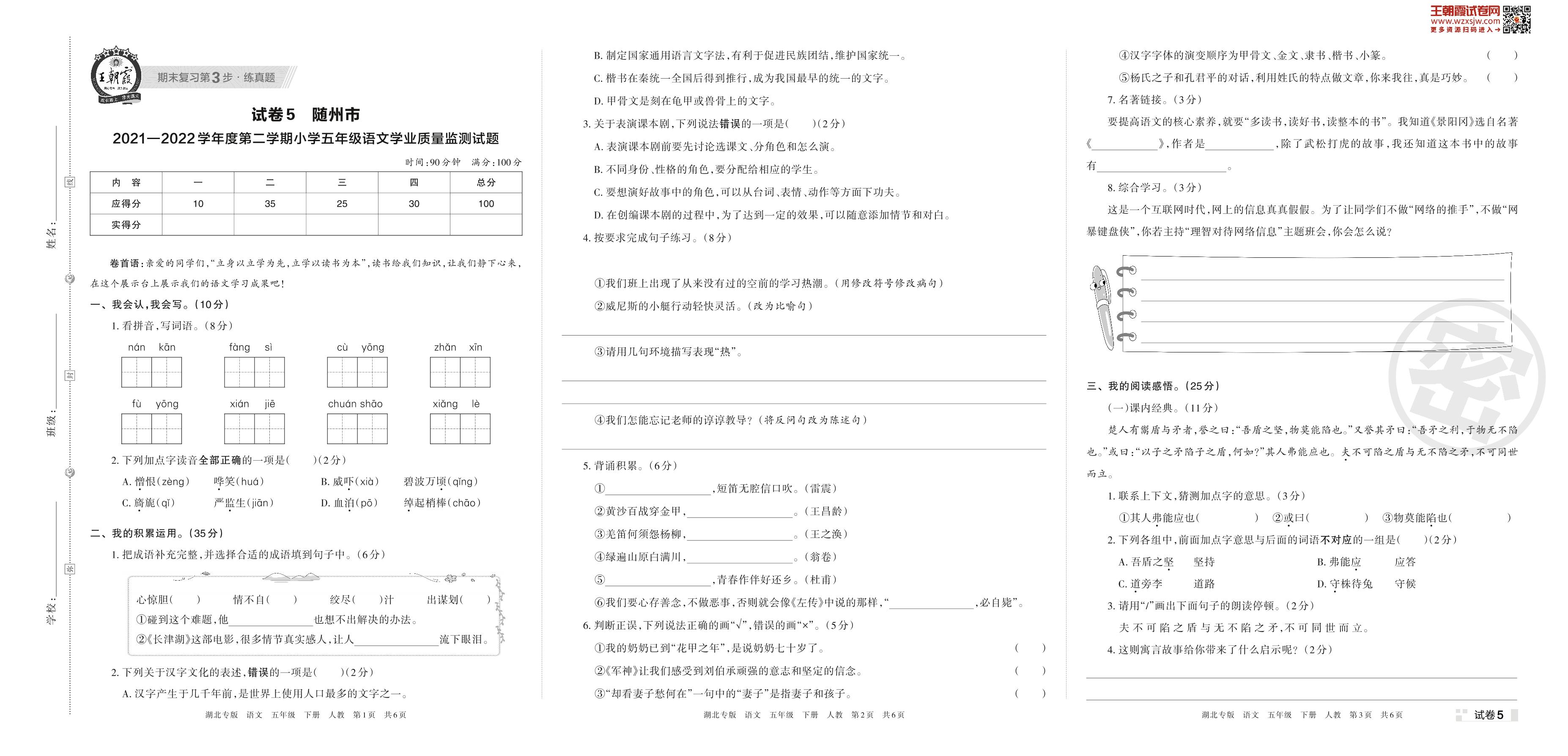 随州市2021—2022学年度第二学期小学五年级语文学业质量监测试题(人教版)【5】