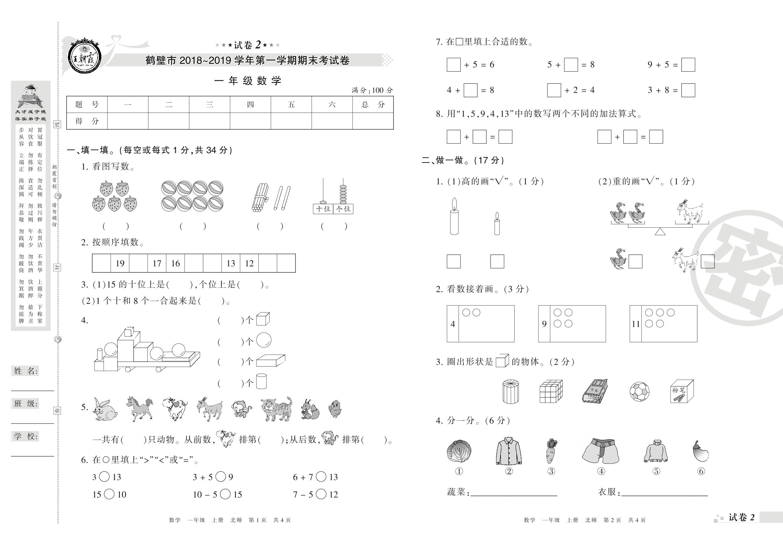 2018-2019学年第一学期鹤壁市一年级数学试卷(北师版)【2】
