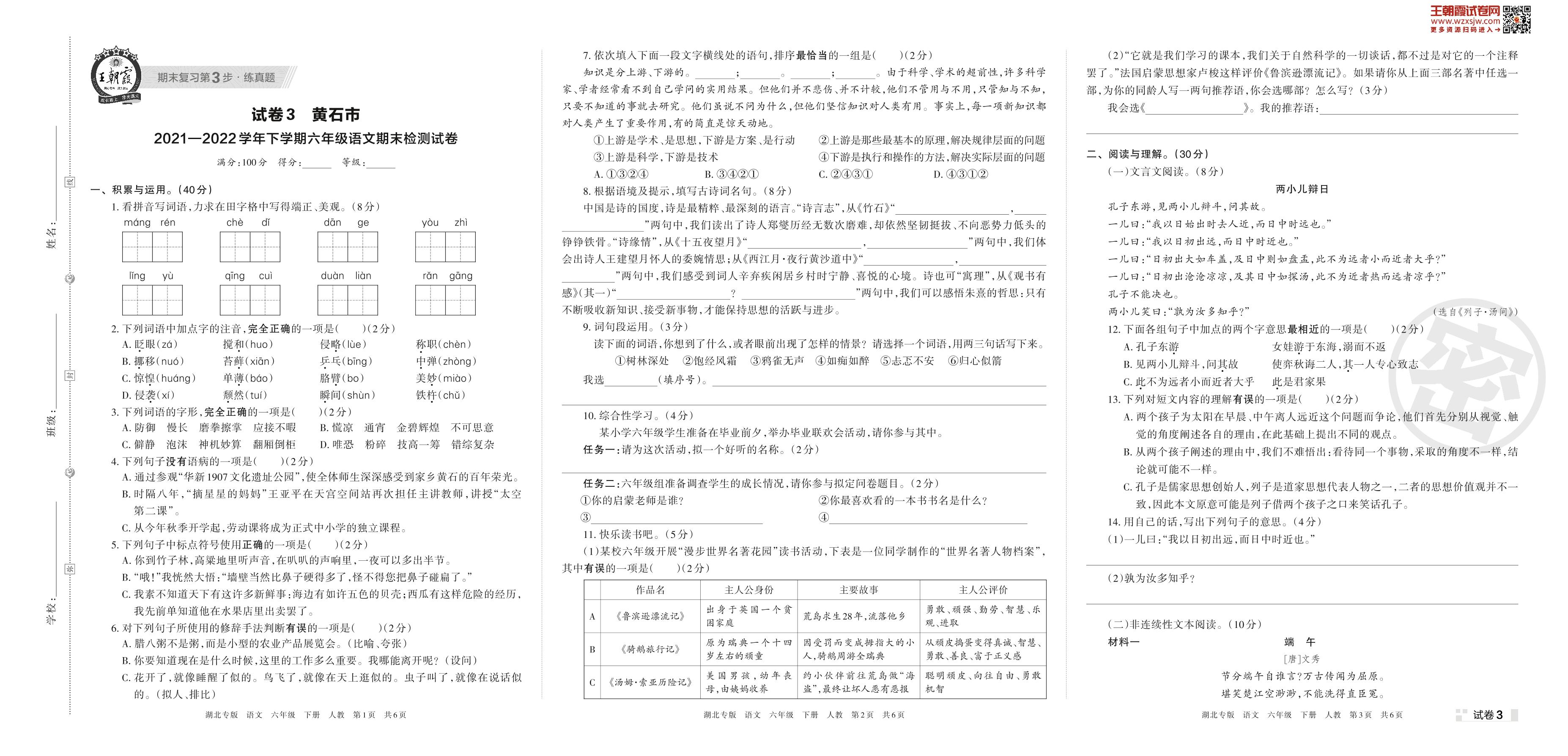 黄石市2021—2022学年下学期六年级语文期末检测试卷(人教版)【3】