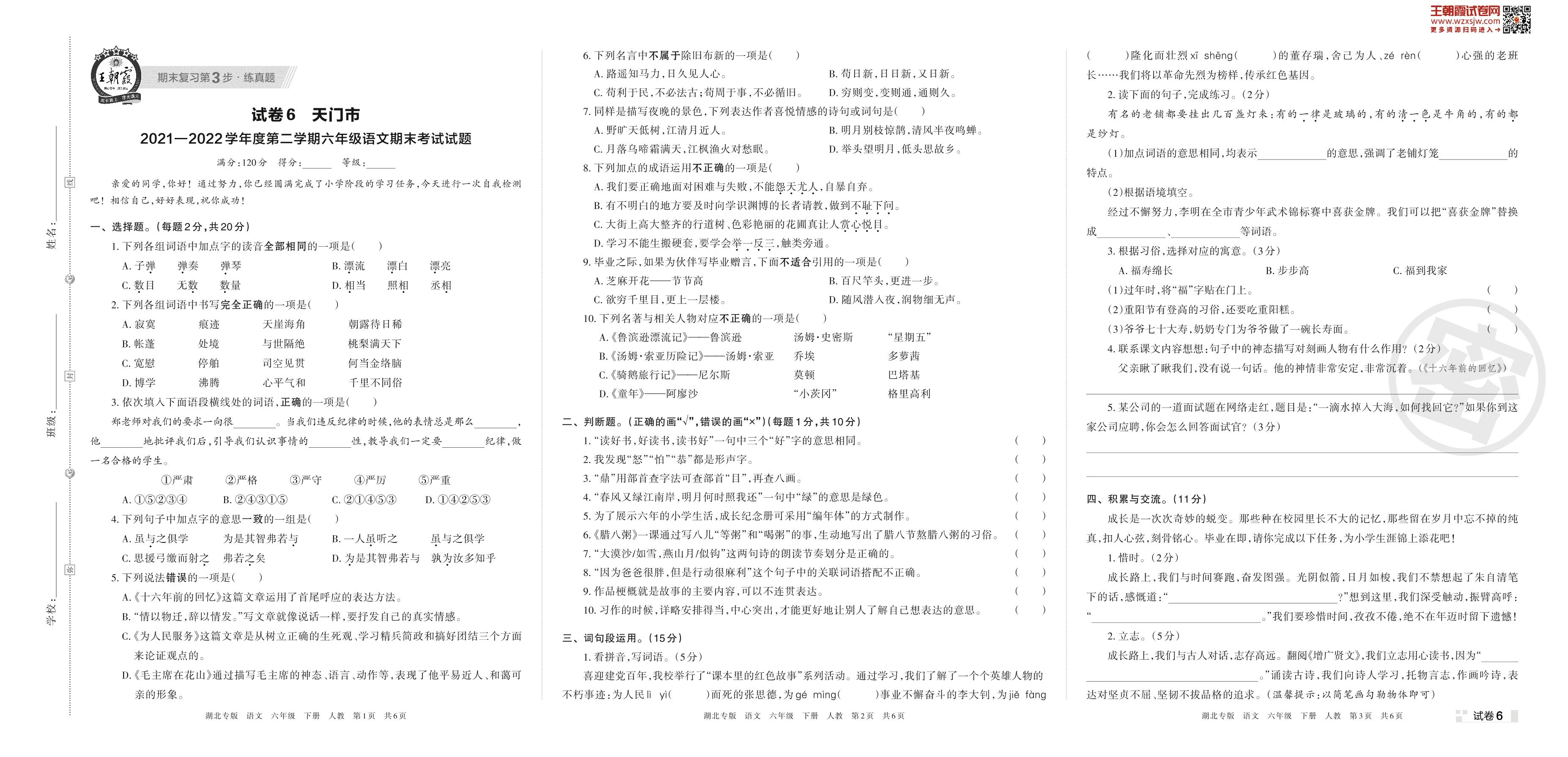 天门市2021—2022学年度第二学期六年级语文期末考试试题(人教版)【6】