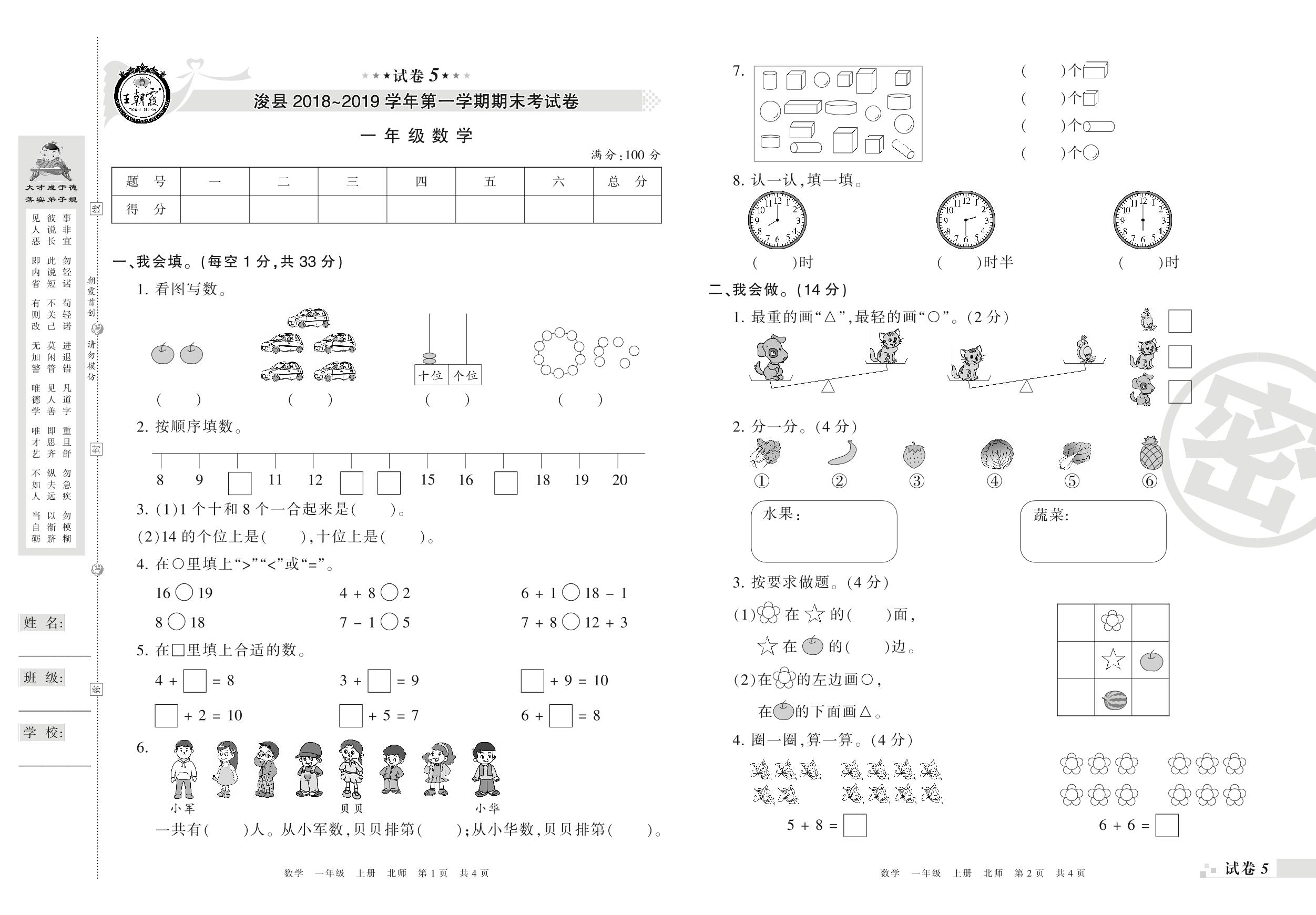 2018-2019学年第一学期鹤壁市浚县一年级数学试卷(北师版)【5】
