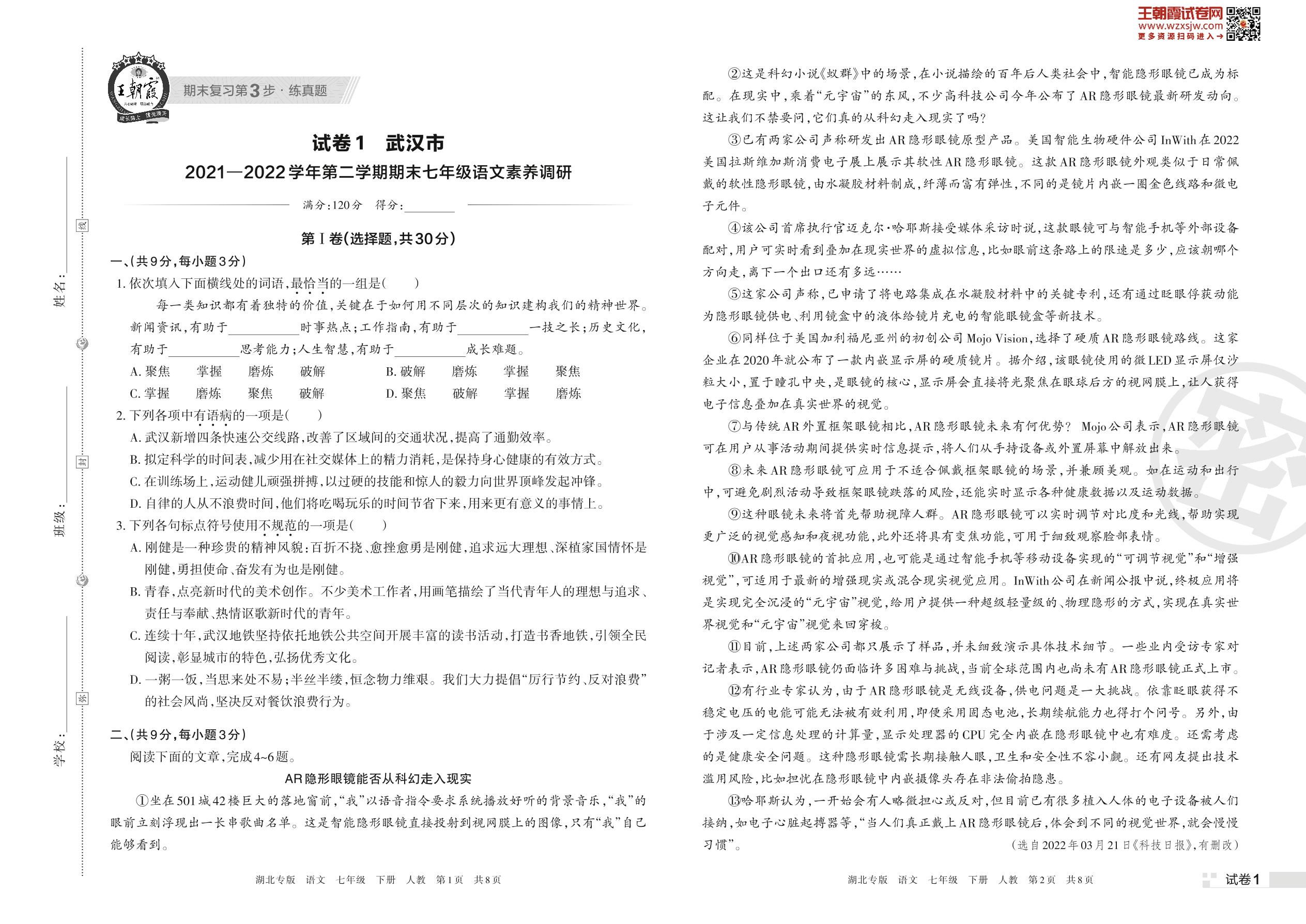 武汉市2021—2022学年第二学期期末七年级语文素养调研(人教版)【1】