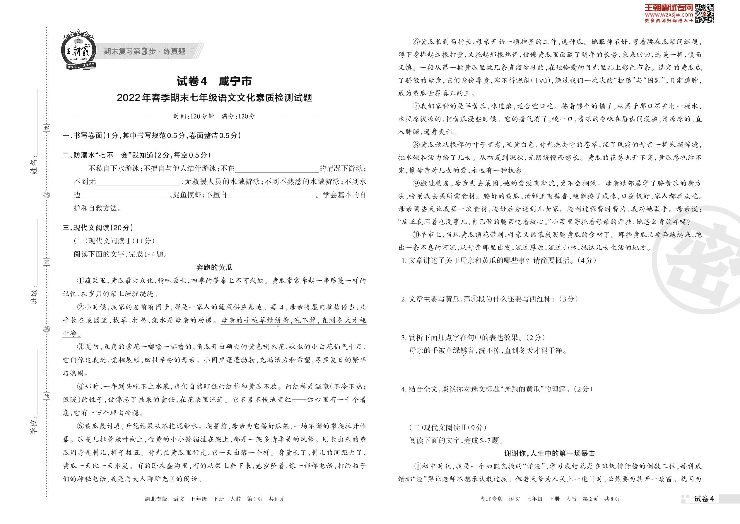 咸宁市2022年春季期末七年级语文文化素质检测试题(人教版)【4】