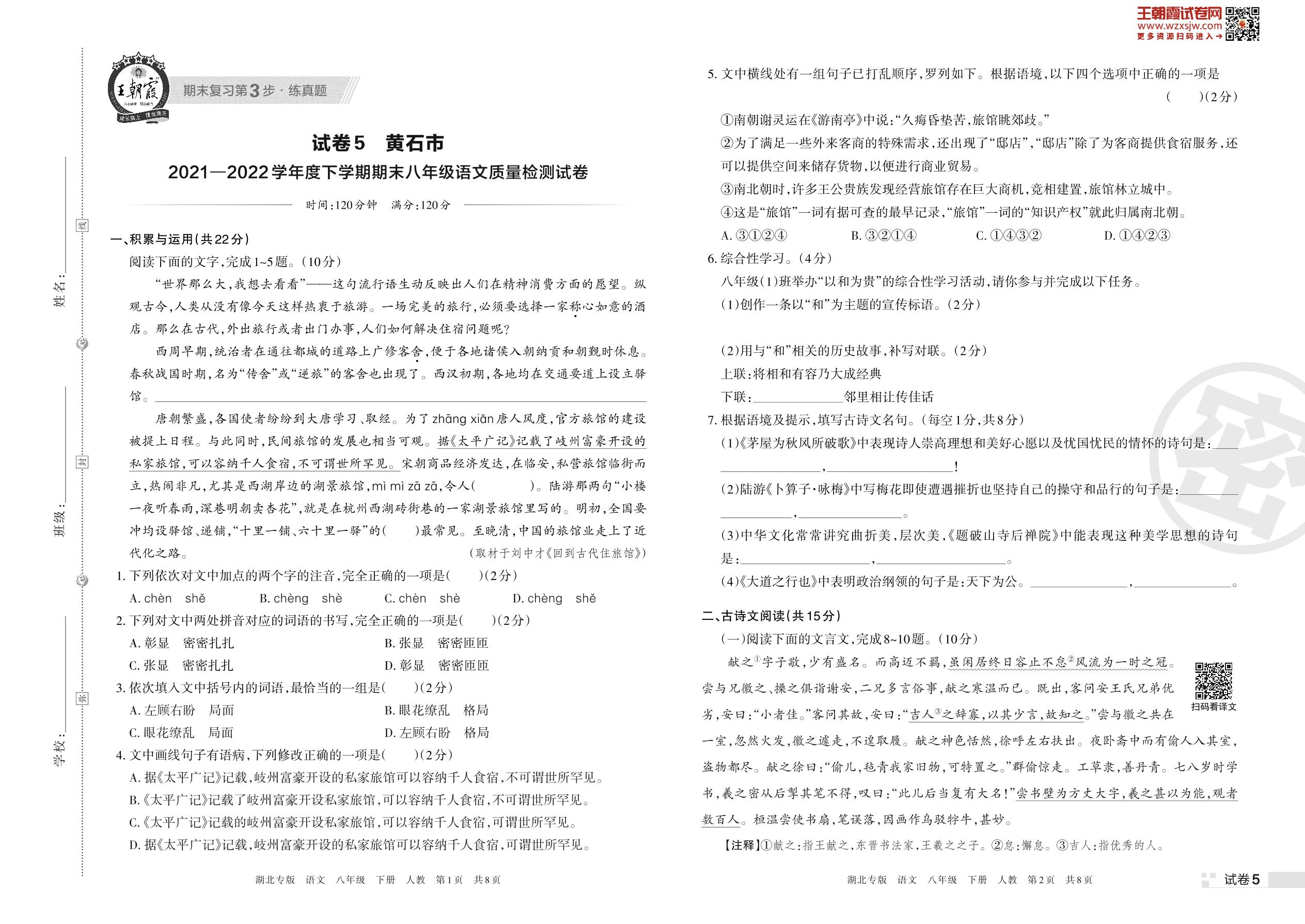黄石市2021—2022学年度下学期期末八年级语文质量检测试卷(人教版)【5】