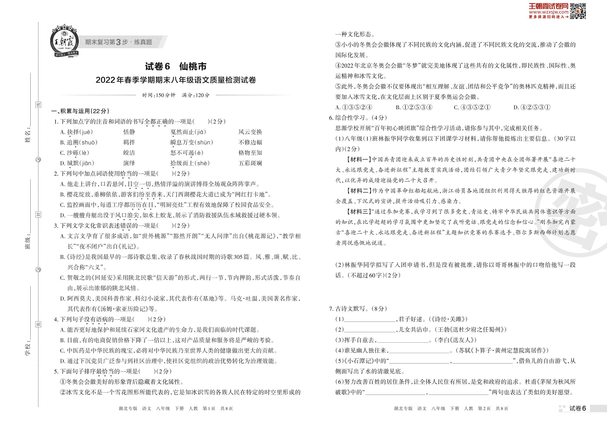 仙桃市2022年春季学期期末八年级语文质量检测试卷(人教版)【6】