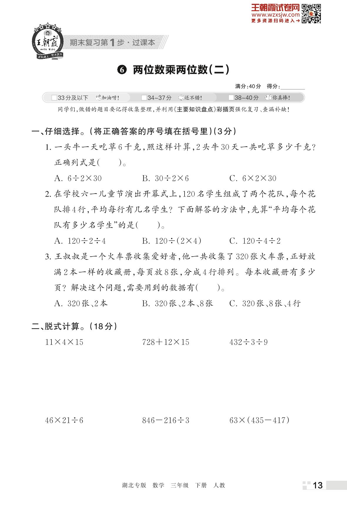 王朝霞期末过课本——6 两位数乘两位数(二)三年级下册数学(人教版)_R230423155731449