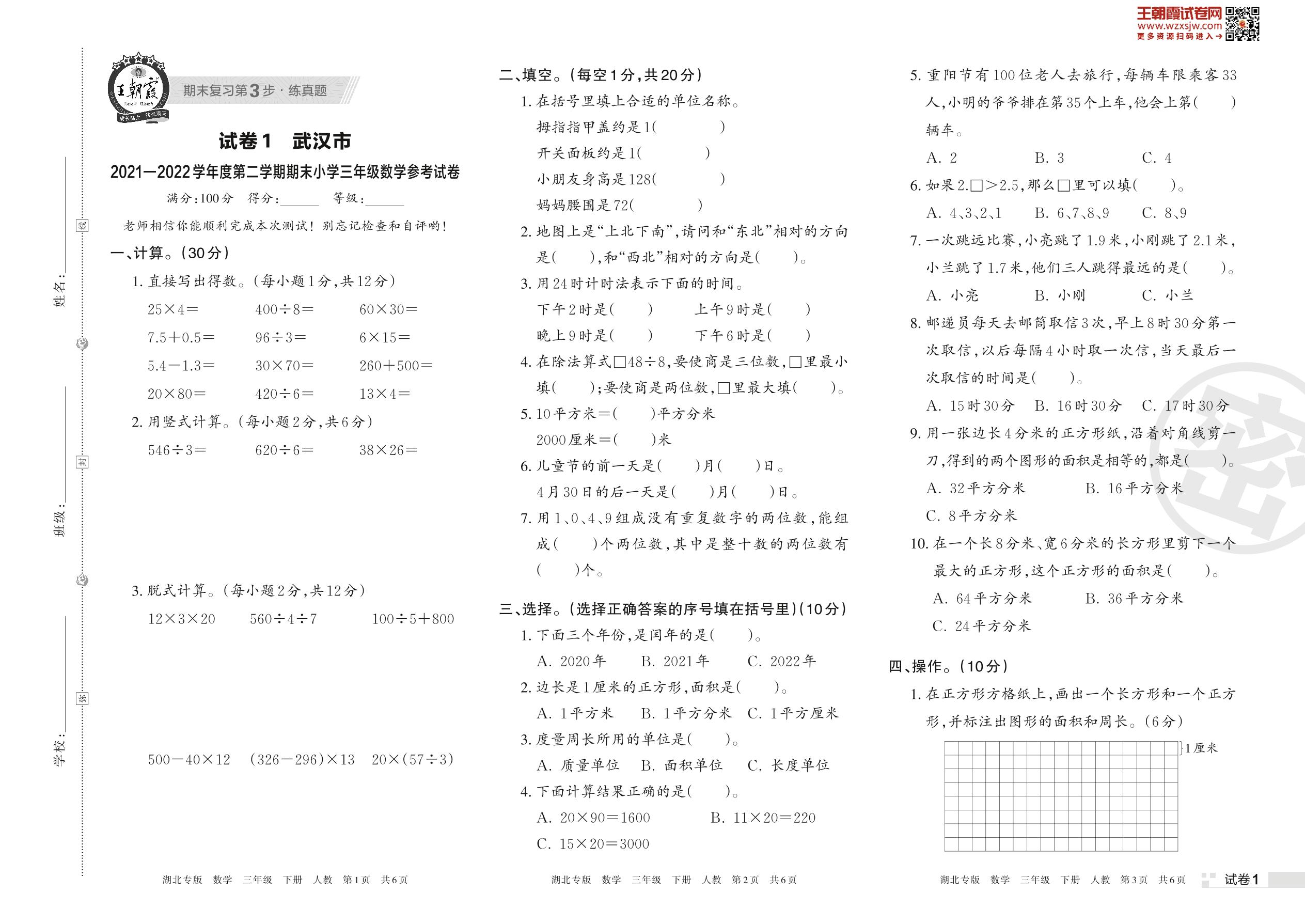 武汉市2021—2022学年度第二学期期末小学三年级数学参考试卷(人教版)【1】