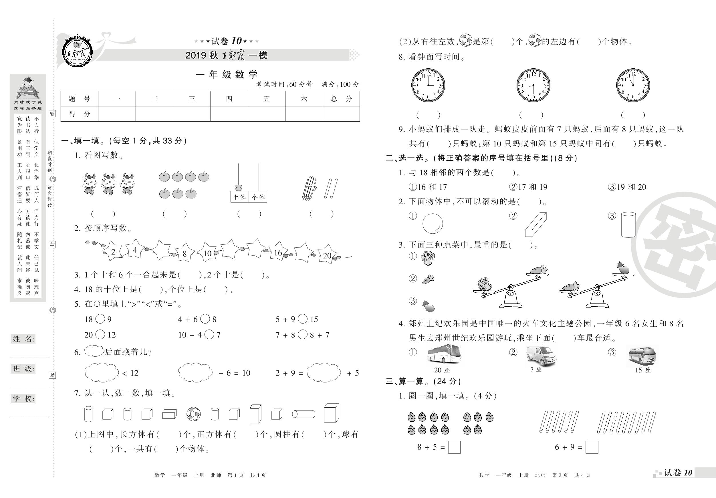 王朝霞期末模拟卷一年级上册数学(北师版)_R210802215713【10】