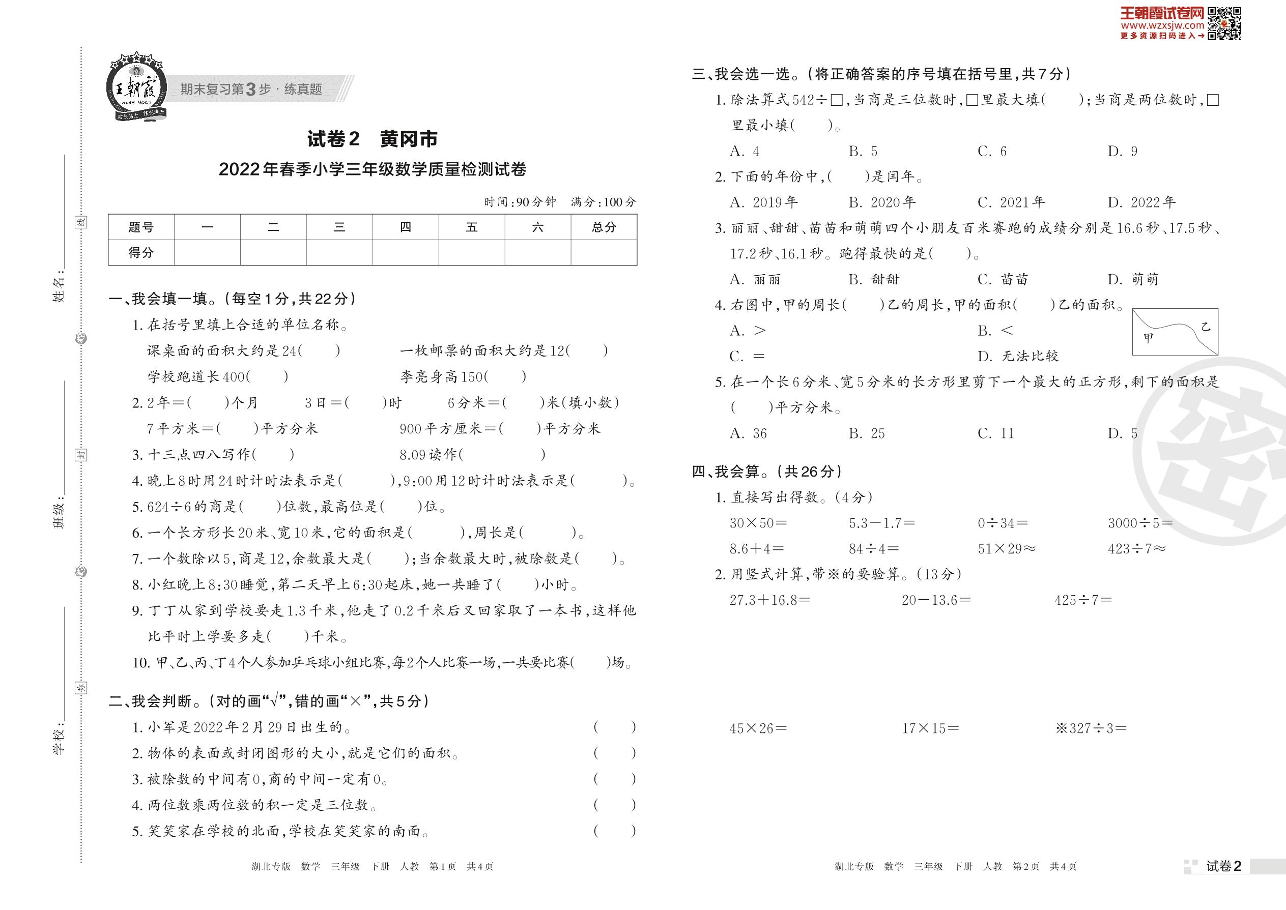 黄冈市2022年春季小学三年级数学质量检测试卷(人教版)【2】