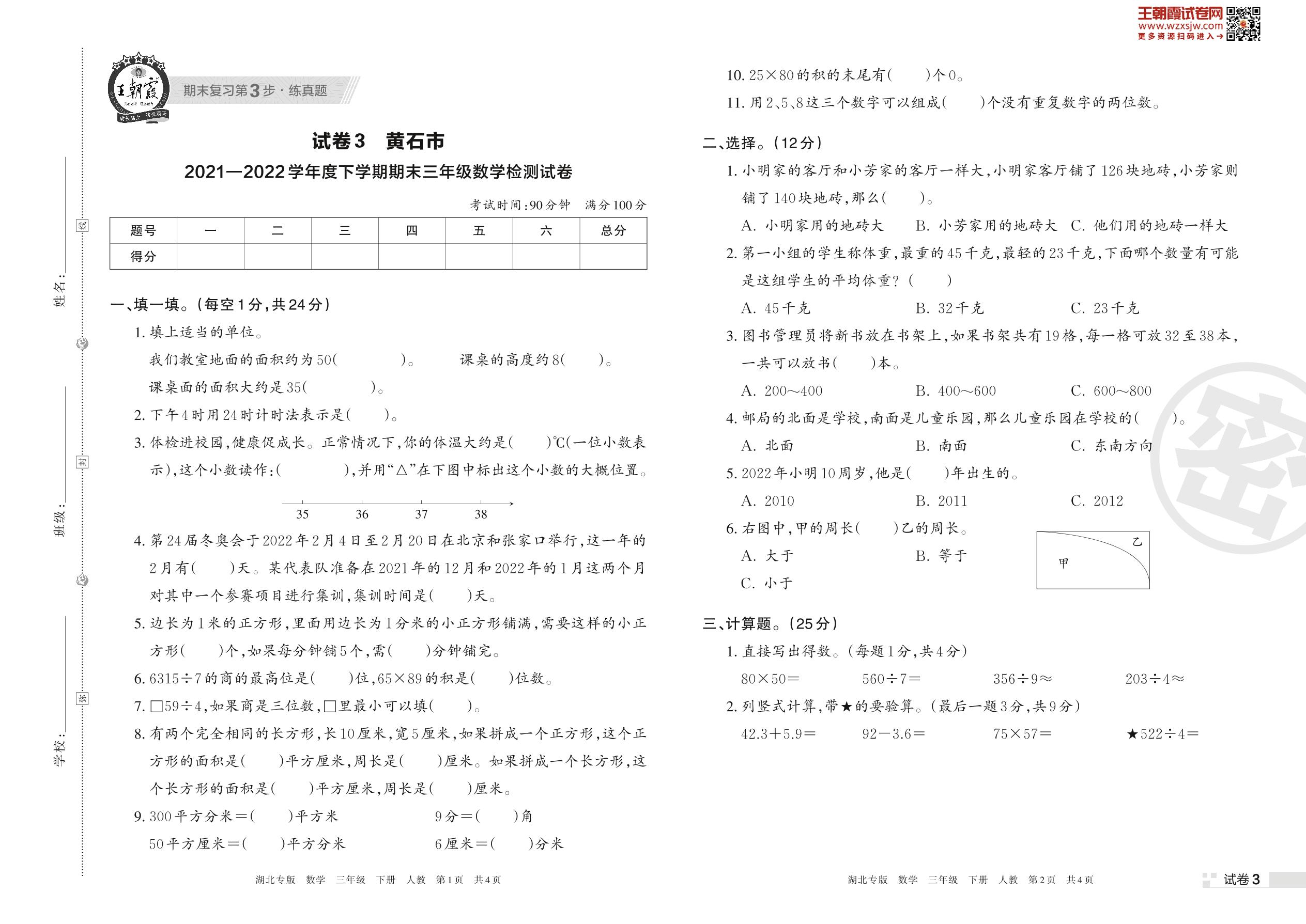 黄石市2021—2022学年度下学期期末三年级数学检测试卷(人教版)【3】
