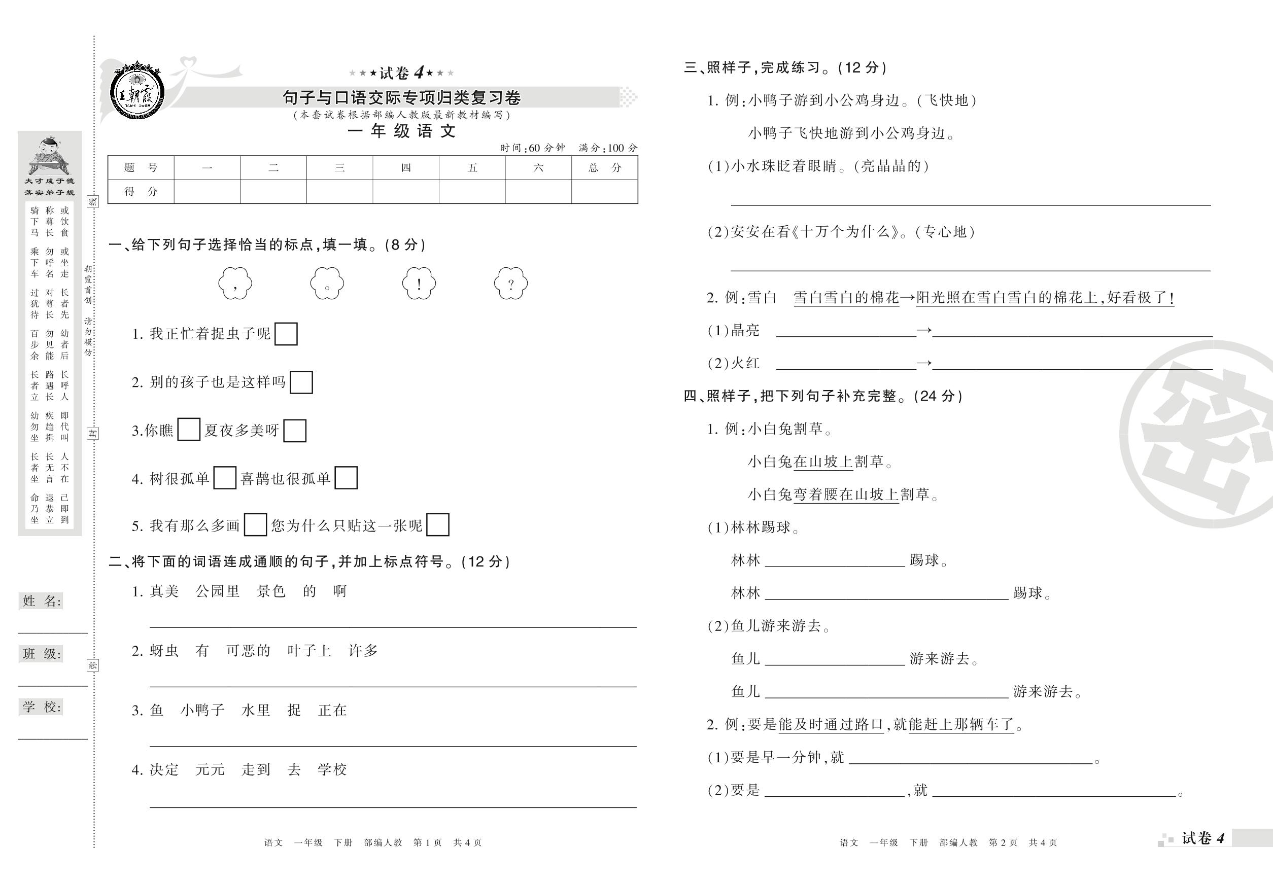 王朝霞期末专项卷——句子与口语交际专项归类复习卷一年级下册语文(人教版)_R210731190600【4】