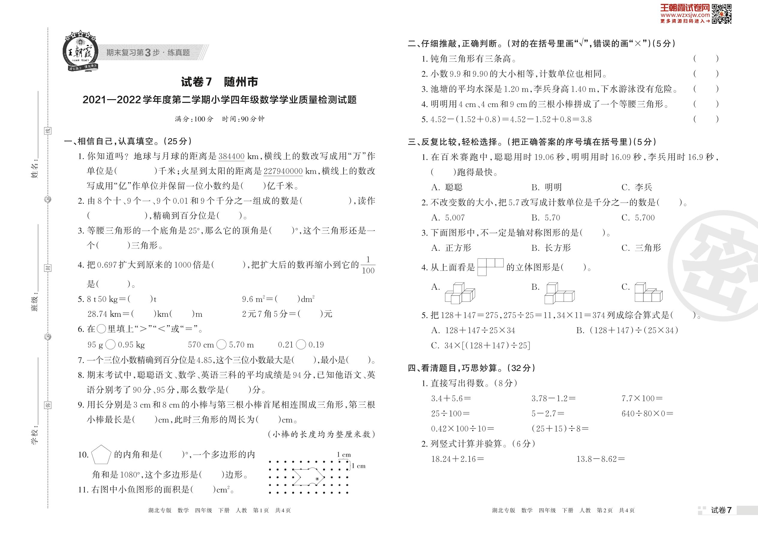 随州市2021—2022学年度第二学期小学四年级数学学业质量检测试题(人教版)【7】