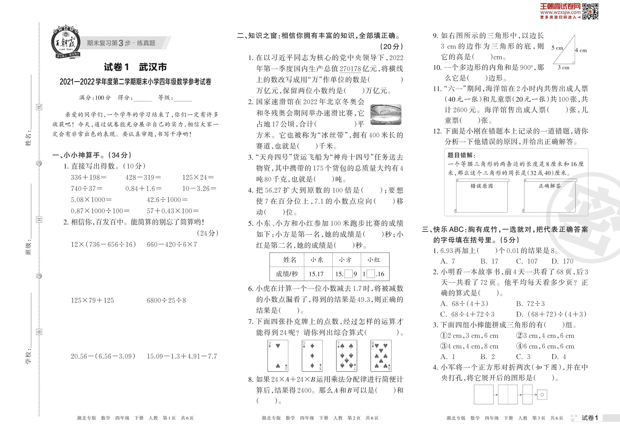 武汉市2021—2022学年度第二学期期末小学四年级数学参考试卷(人教版)【1】