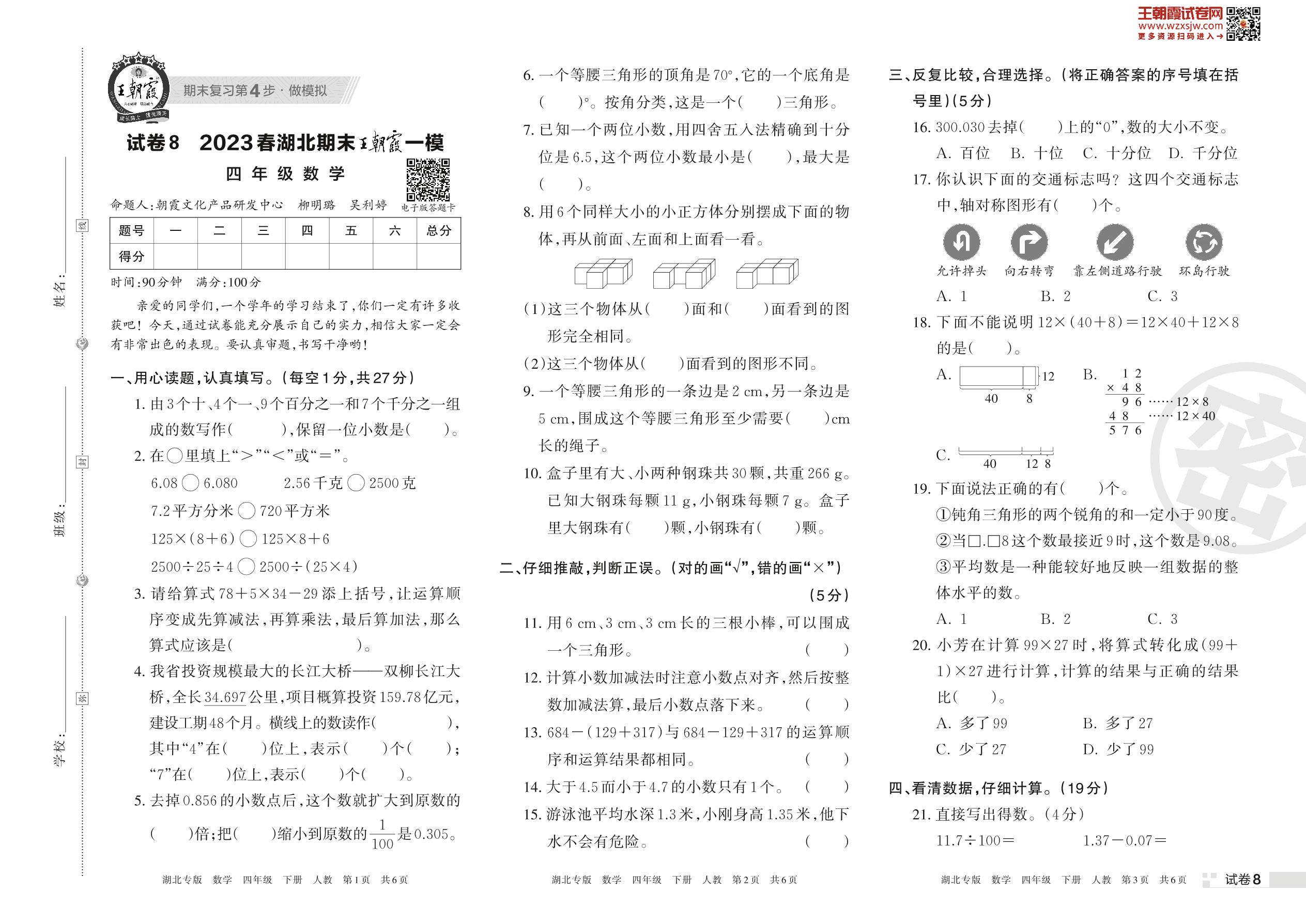 王朝霞期末模拟卷四年级下册数学(人教版)_R230423160251449【8】