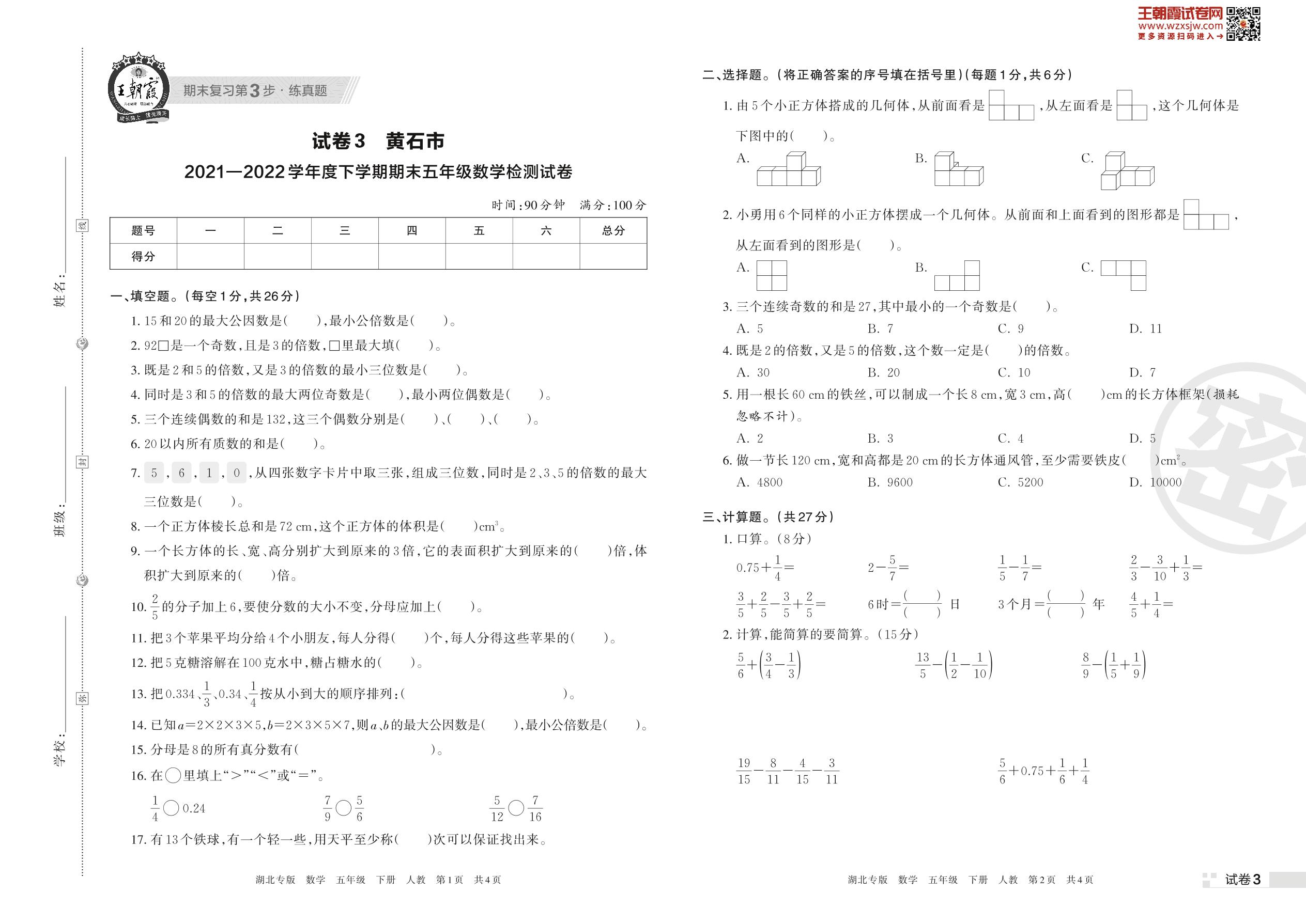 黄石市2021—2022学年度下学期期末五年级数学检测试卷(人教版)【3】