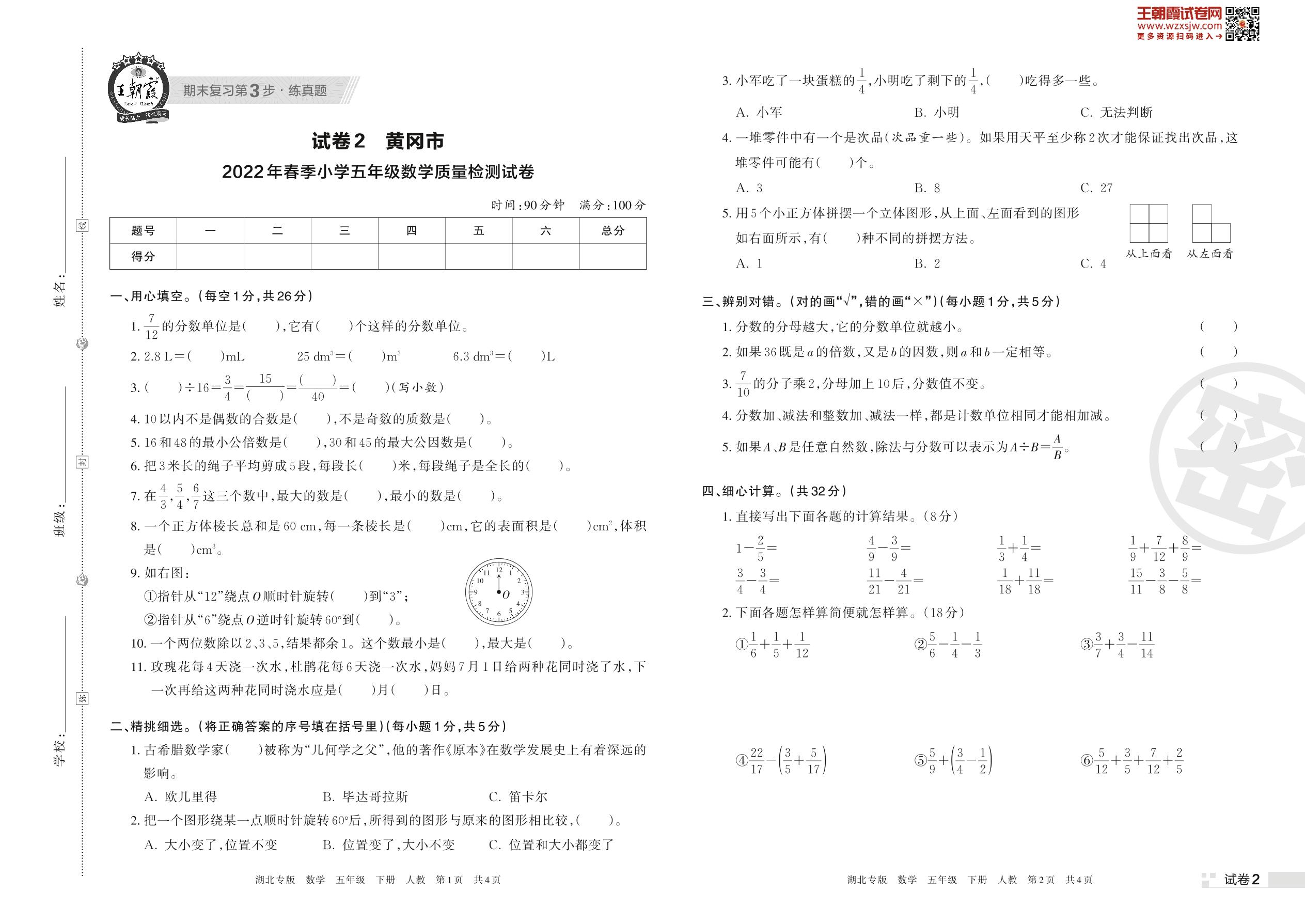 黄冈市2022年春季小学五年级数学质量检测试卷(人教版)【2】
