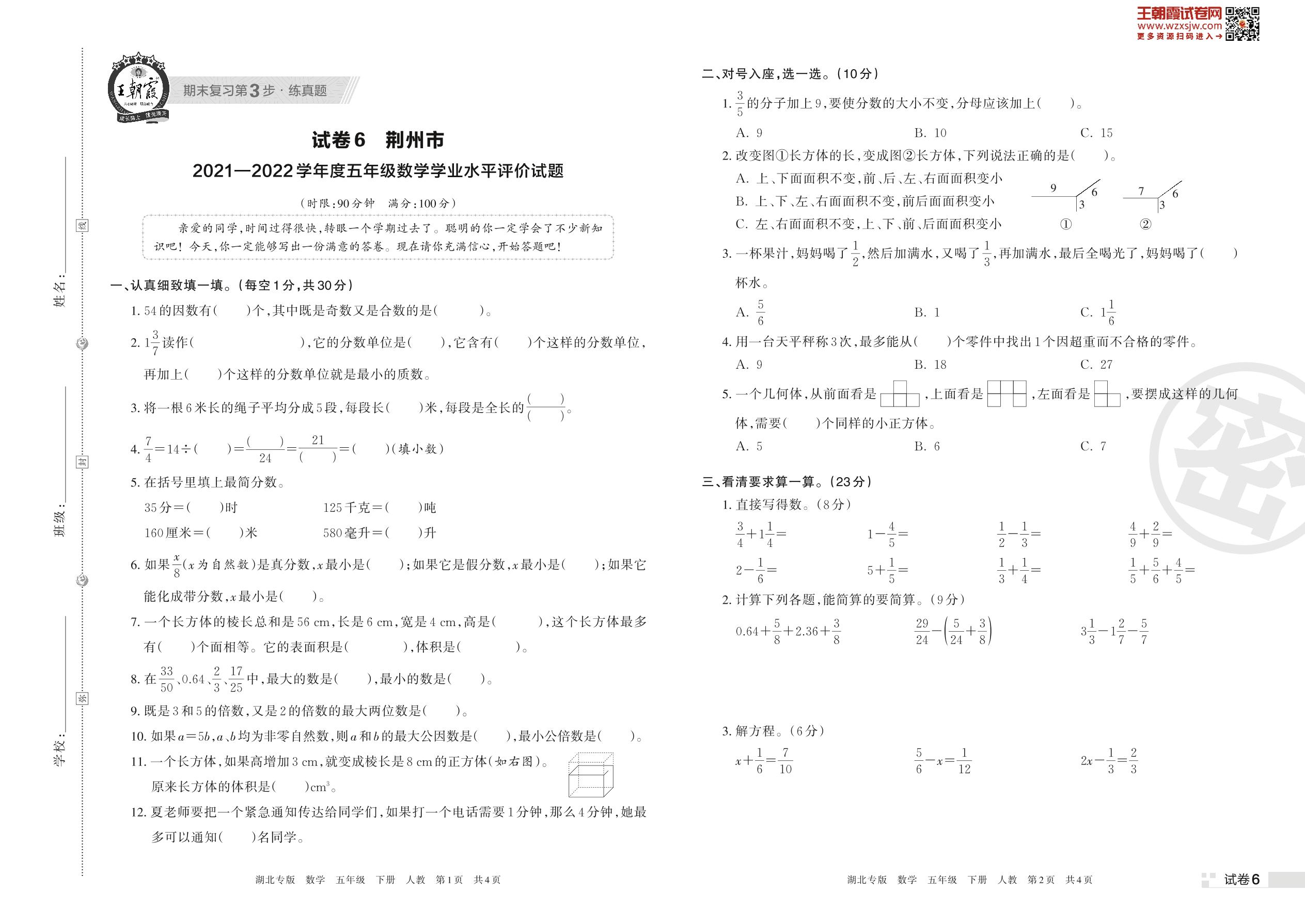 荆州市2021—2022学年度五年级数学学业水平评价试题(人教版)【6】