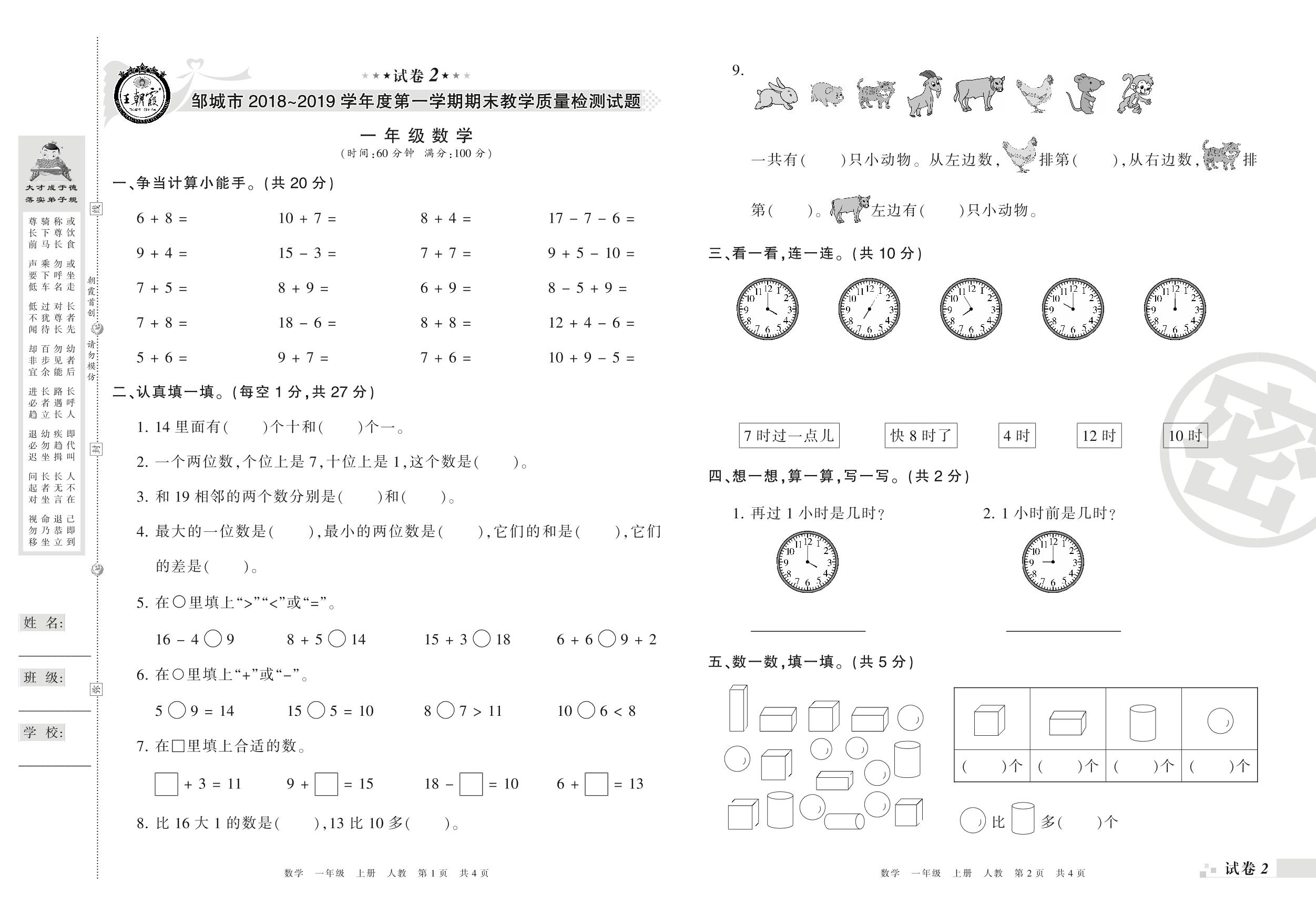 2018-2019学年第一学期邹城市一年级数学试卷(人教版)【2】