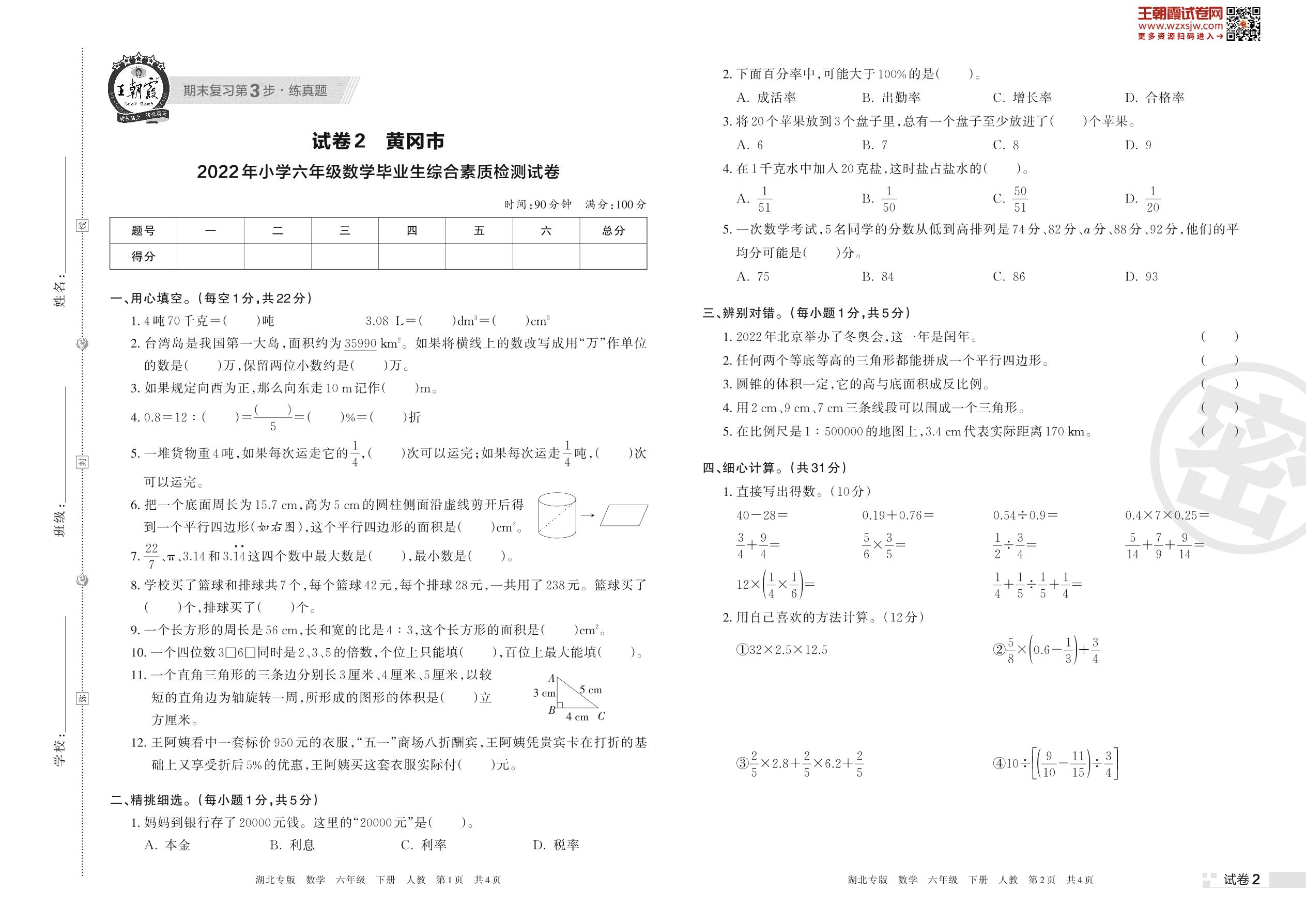 黄冈市2022年小学六年级数学毕业生综合素质检测试卷(人教版)【2】