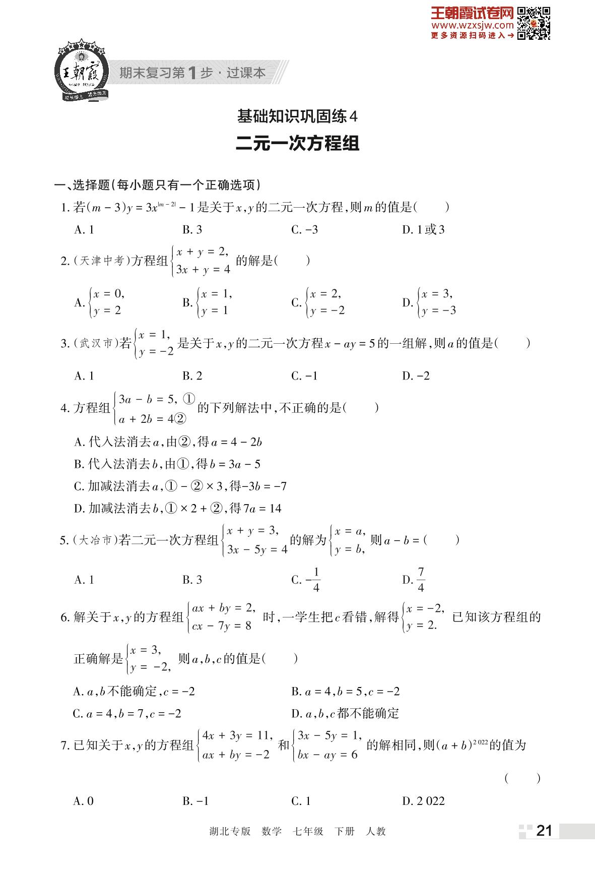 王朝霞期末过课本——基础知识巩固练4 二元一次方程组七年级下册数学(人教版)_R230423162936104