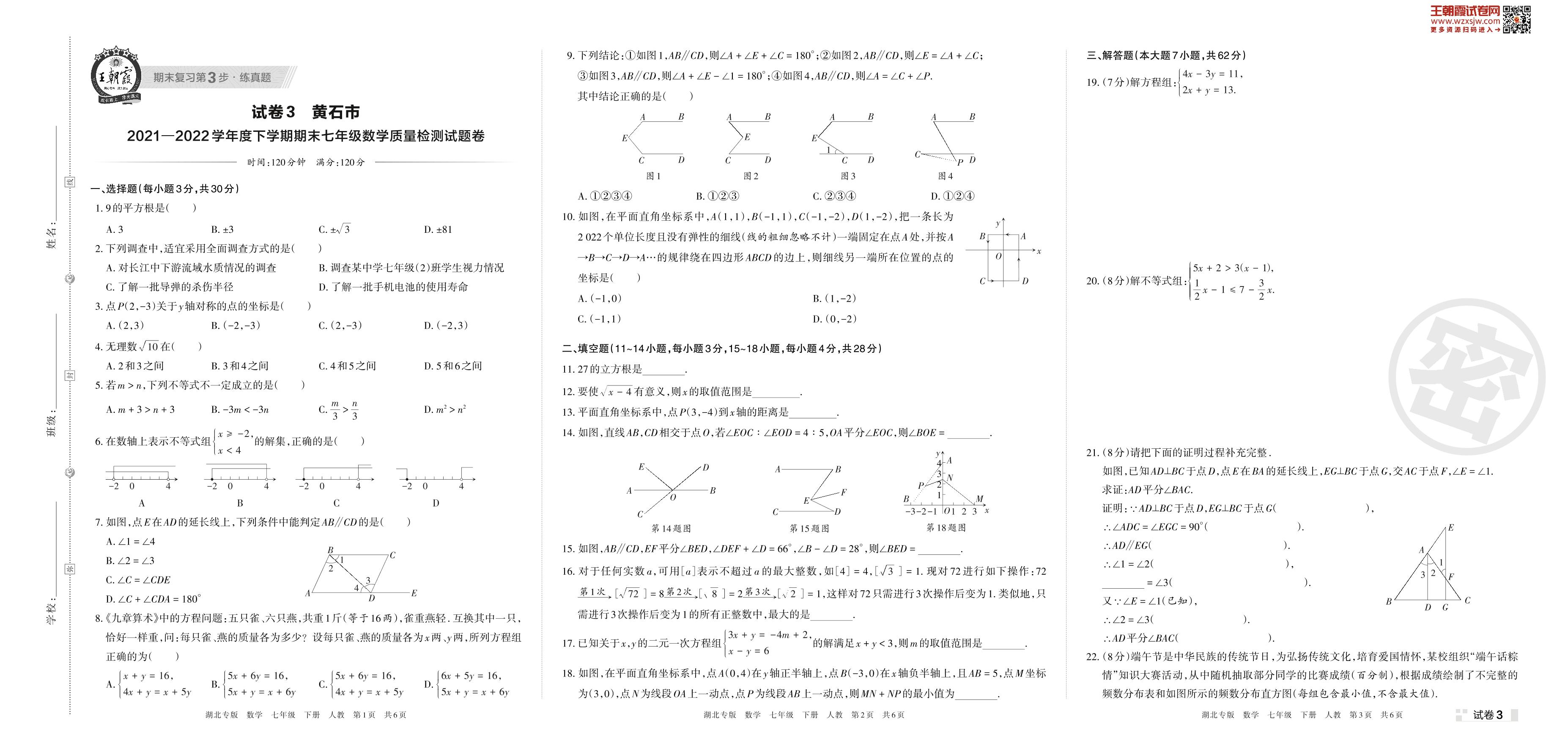 黄石市2021—2022学年度下学期期末七年级数学质量检测试题卷(人教版)【3】