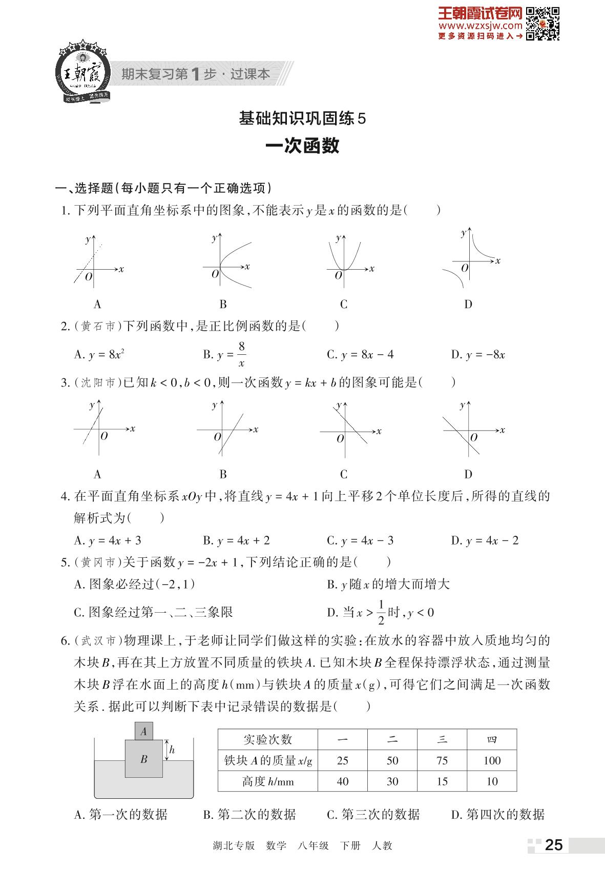 王朝霞期末过课本——基础知识巩固练5 一次函数八年级下册数学(人教版)